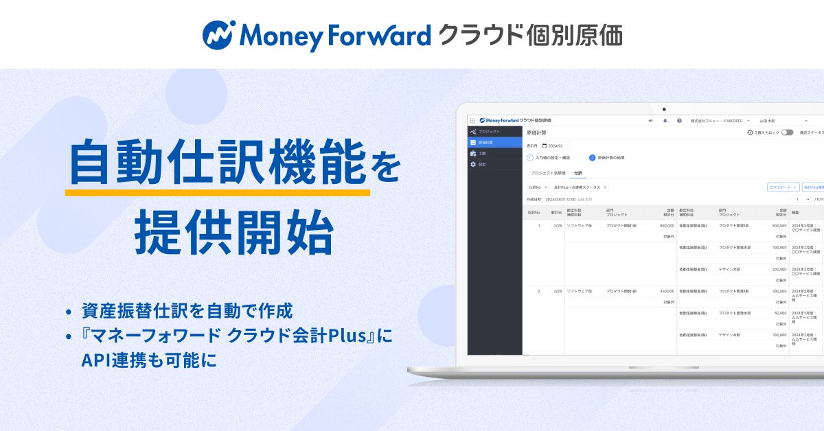 株式会社マネーフォワードは、『マネーフォワード クラウド個別原価』において、原価計算結果をもとに資産振替仕訳を自動作成し、『マネーフォワード クラウド会計Plus』に連携できる「自動仕訳機能」の提供を開始しました。