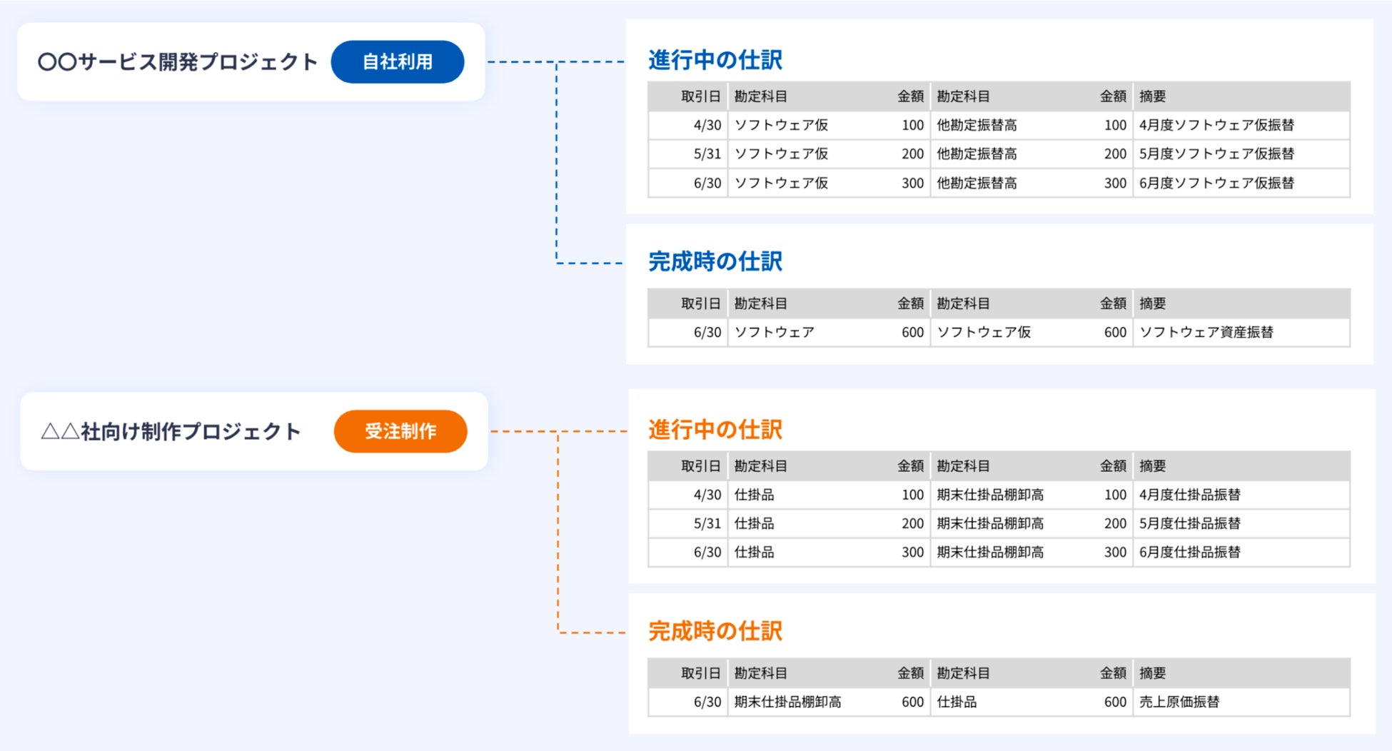 本機能により、プロジェクトの属性や状態に応じた仕訳ルールをあらかじめ設定し、適切な資産勘定への振替仕訳を自動作成することができます。例えば、ソフトウェアサービスの開発プロジェクトの場合、開発途中の原価はソフトウェア仮勘定に振り替え、開発が完了したらソフトウェアに振り替える、といった仕訳の自動作成が可能です。