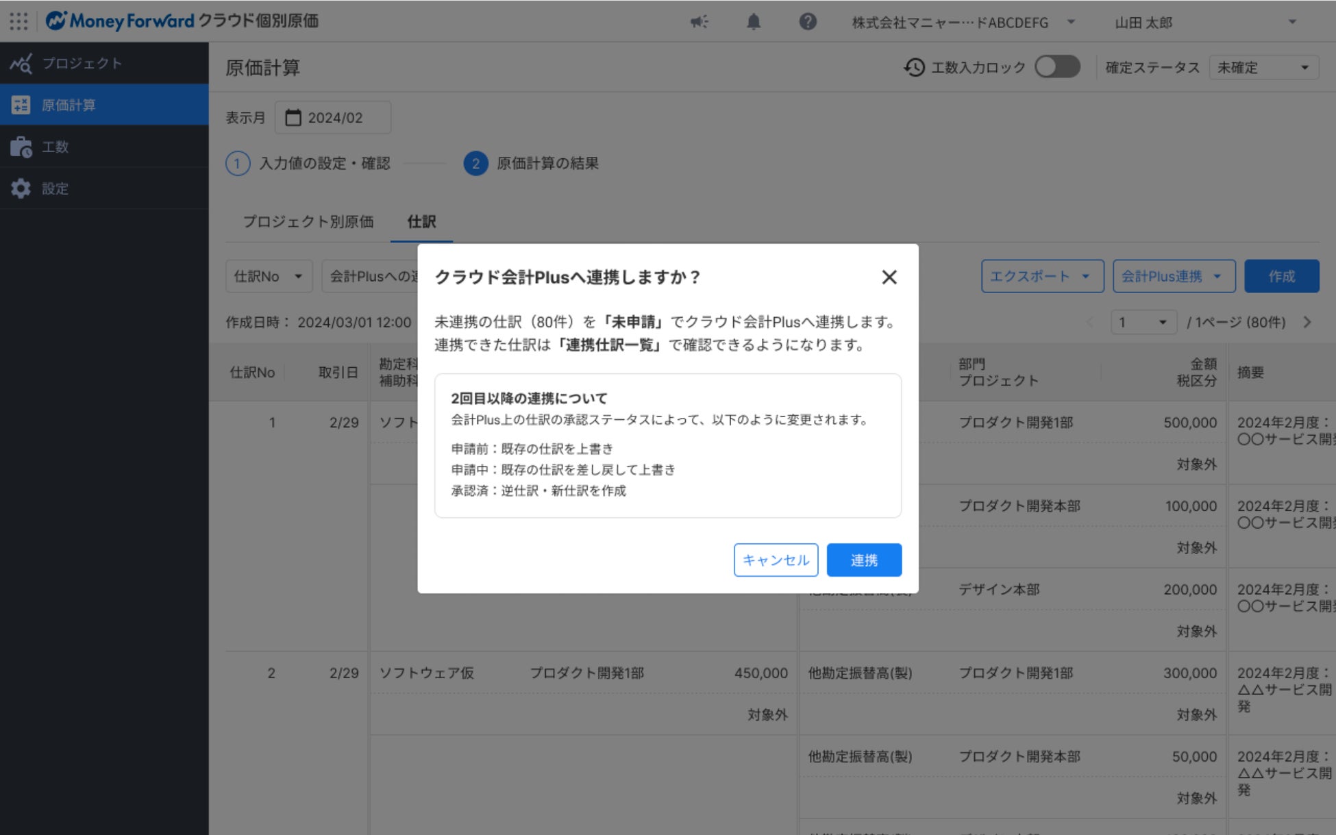 また、『マネーフォワード クラウド会計Plus』とのAPI連携により、『マネーフォワード クラウド個別原価』で作成した仕訳をワンクリックで会計システムに取り込むことができるため、内部統制を担保しながら、月次決算業務の効率化を実現します。