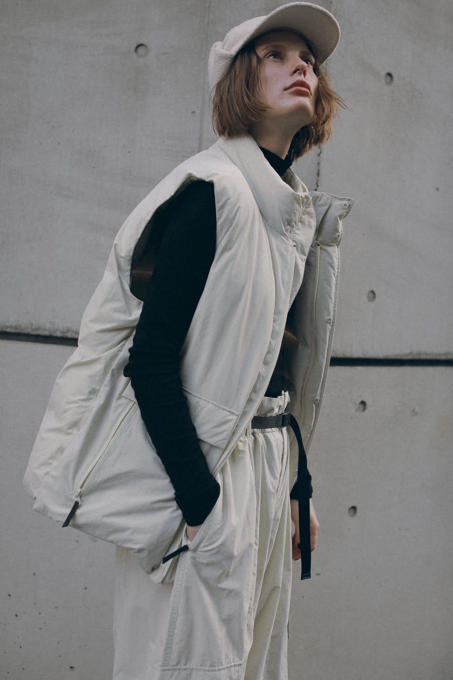 程よいボリューム感で仕立てたダウンベスト。分厚過ぎずもたつかないため、スタイリッシュに着こなせるシルエットに。アウトドア感が出過ぎないよう設計されたフォルムは、街中でも自然に馴染むバランスにこだわったポイント。