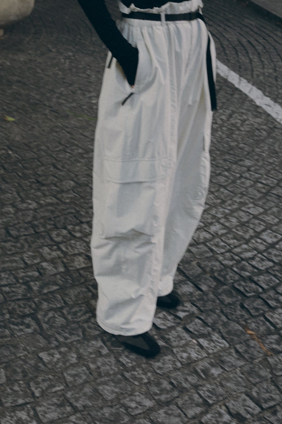 大胆なボリューム感が魅力のパラシュートパンツ。脇に施した立体的なポケットが奥行きのあるシルエットを際立たせるデザイン。ハイウエストでスタイルアップを叶えつつ、ウエスト内側にはゴムストッパーを配して安定感のある穿き心地を実現しました。