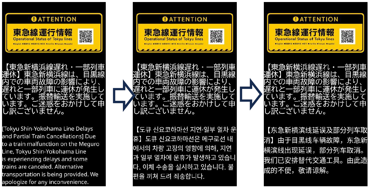 日本語で提供されている「東急線運行情報メール」の内容を「Cotopat® Mobile」端末で受信し、端末内で日本語に加え任意の外国語に翻訳・文字化し、駅サイネージに表示します。