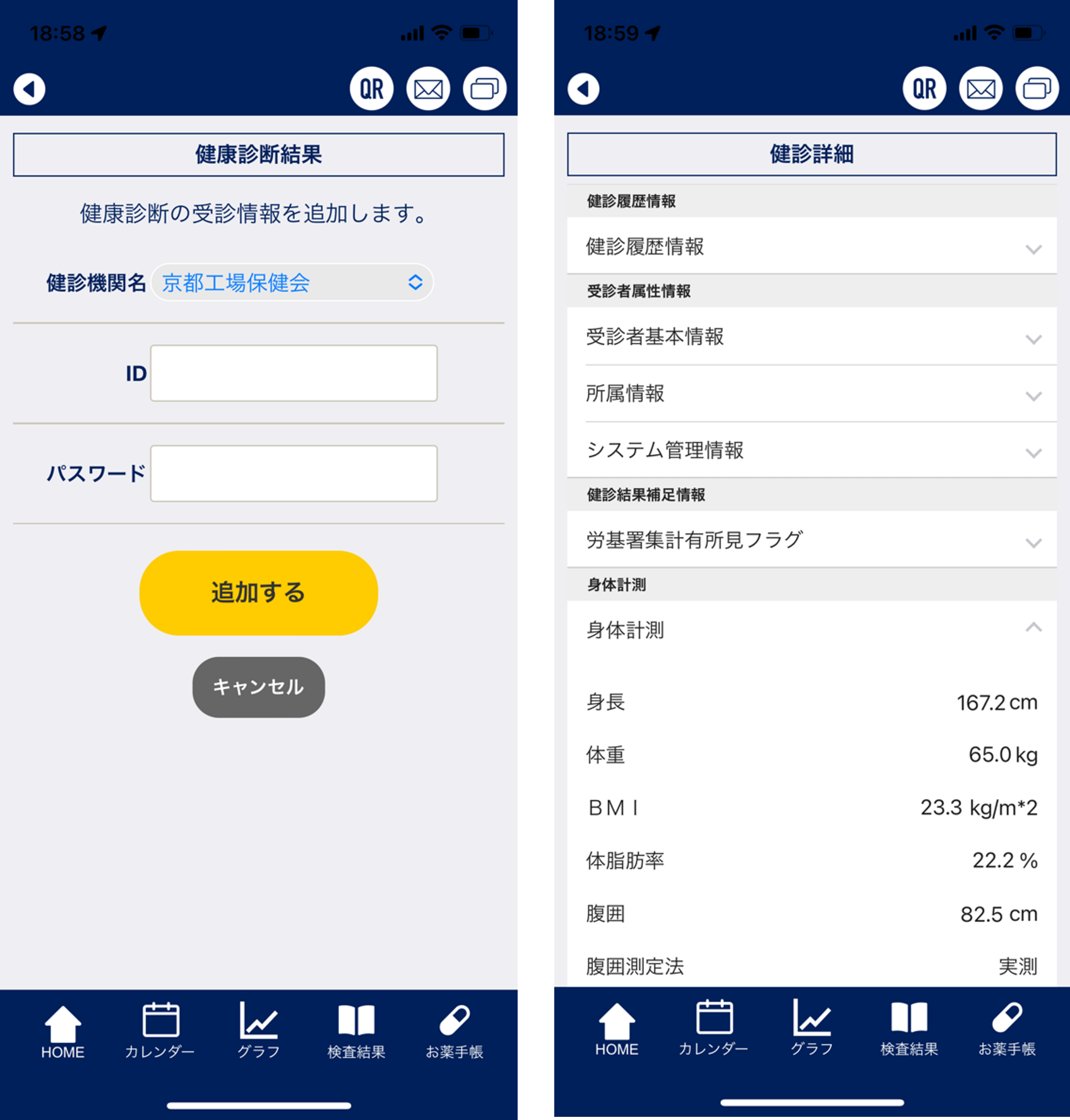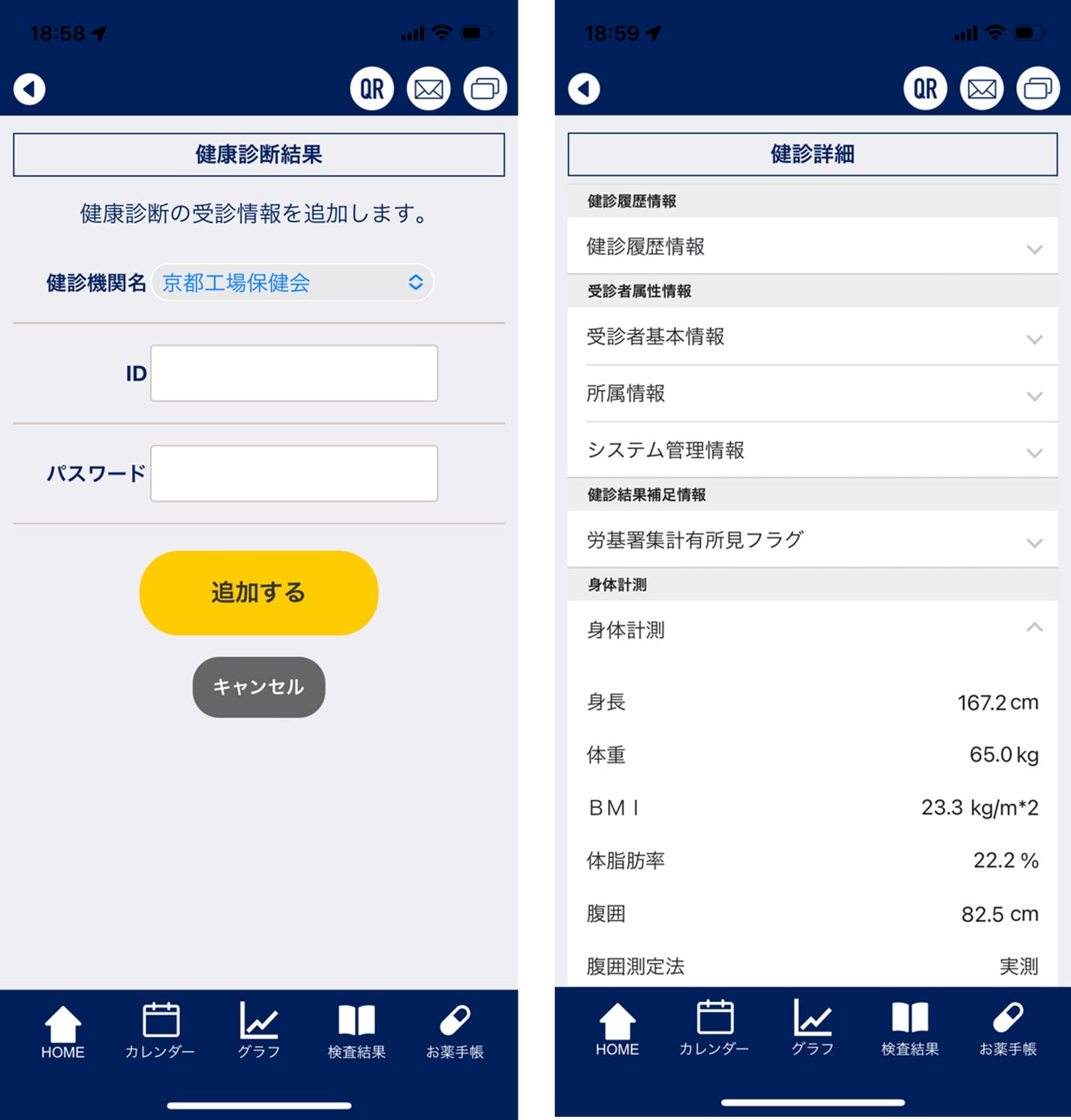 健康診断や検査の結果を、『健康日記』アプリ内でほぼリアルタイムに閲覧することができます。