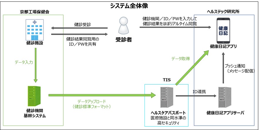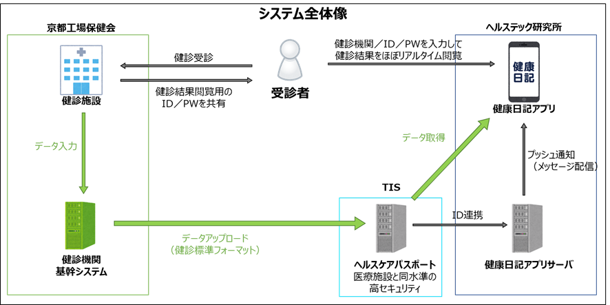株式会社ヘルステック研究所(本社:京都府京都市 代表取締役:阿部達也、以下 ヘルステック研究所)と、TISインテックグループのTIS株式会社(所在地:東京都新宿区 代表取締役社長:岡本安史、以下 TIS)は、一般財団法人京都工場保健会(本部:京都府京都市 会長:丸中良典、以下 京都工場保健会)の協力のもと、受診者が自身の健康診断の結果をスマートフォンアプリ『健康日記』内でリアルタイムに閲覧できるシステムを共同で開発しました。本システムは今秋以降に実施される京都工場保健会の健康診断で実装予定です。