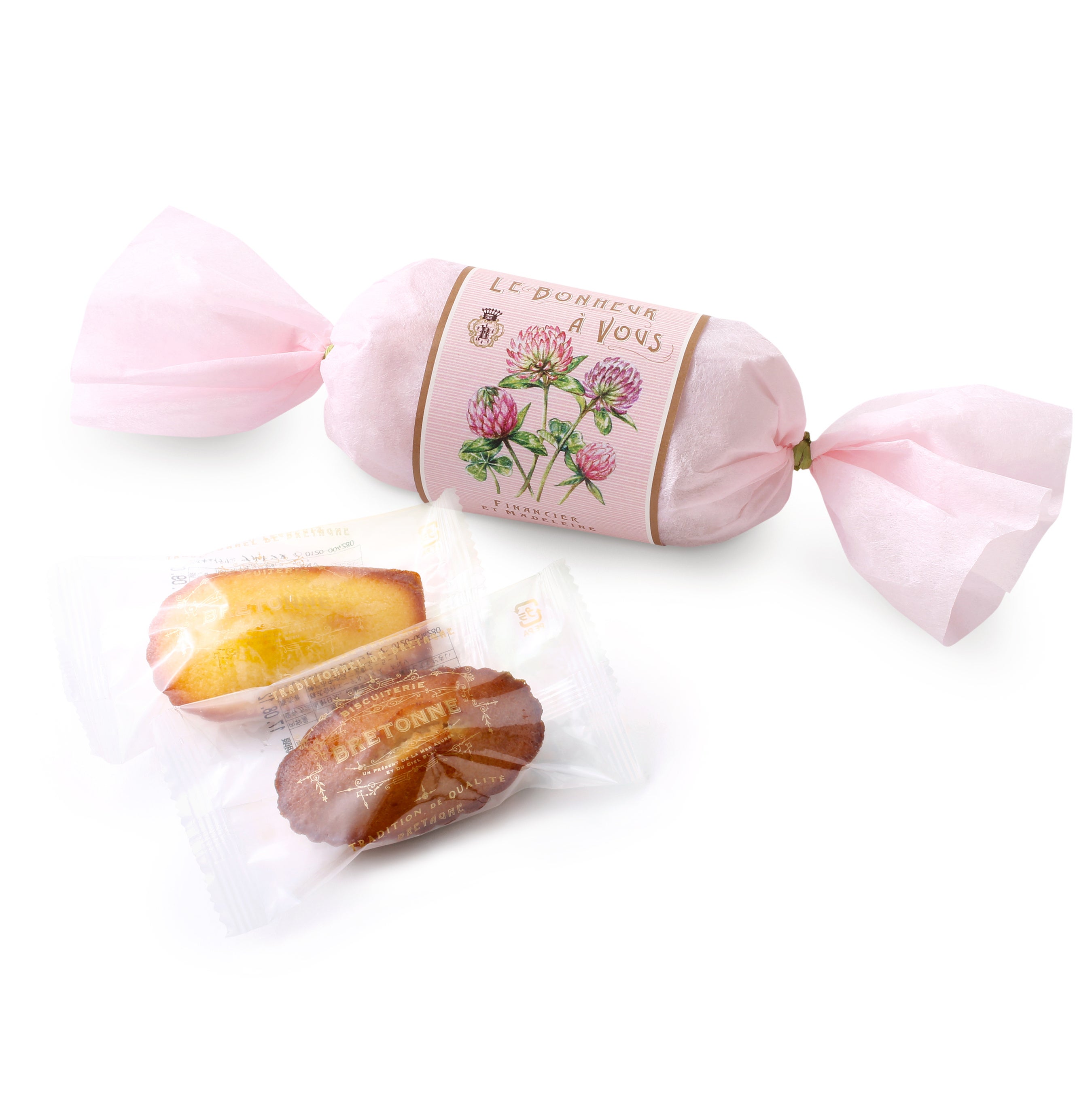 ピンク色のクローバーのイラストが添えられたバレンタイン限定デザインのかわいいキャンディ型の包みの中に、バターの風味豊かなフィナンシェとマドレーヌ入り。