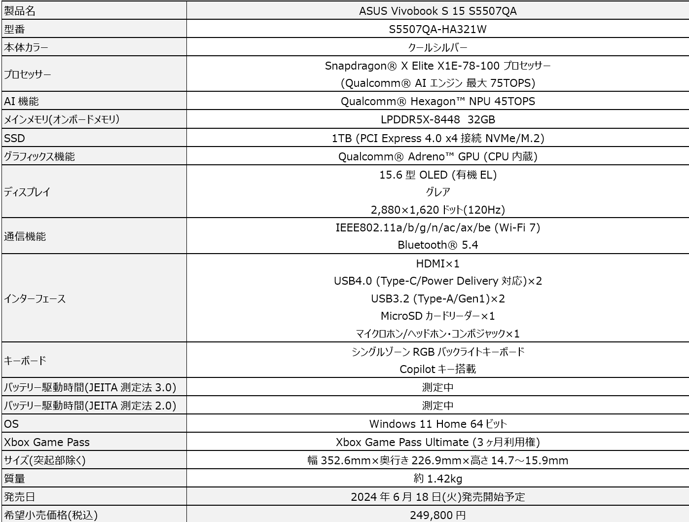 ASUS、次世代CPU「Qualcomm® Snapdragon® X Eliteプロセッサー」を搭載した初のCopilot+ PC、「ASUS Vivobook S 15 S5507QA」を発表