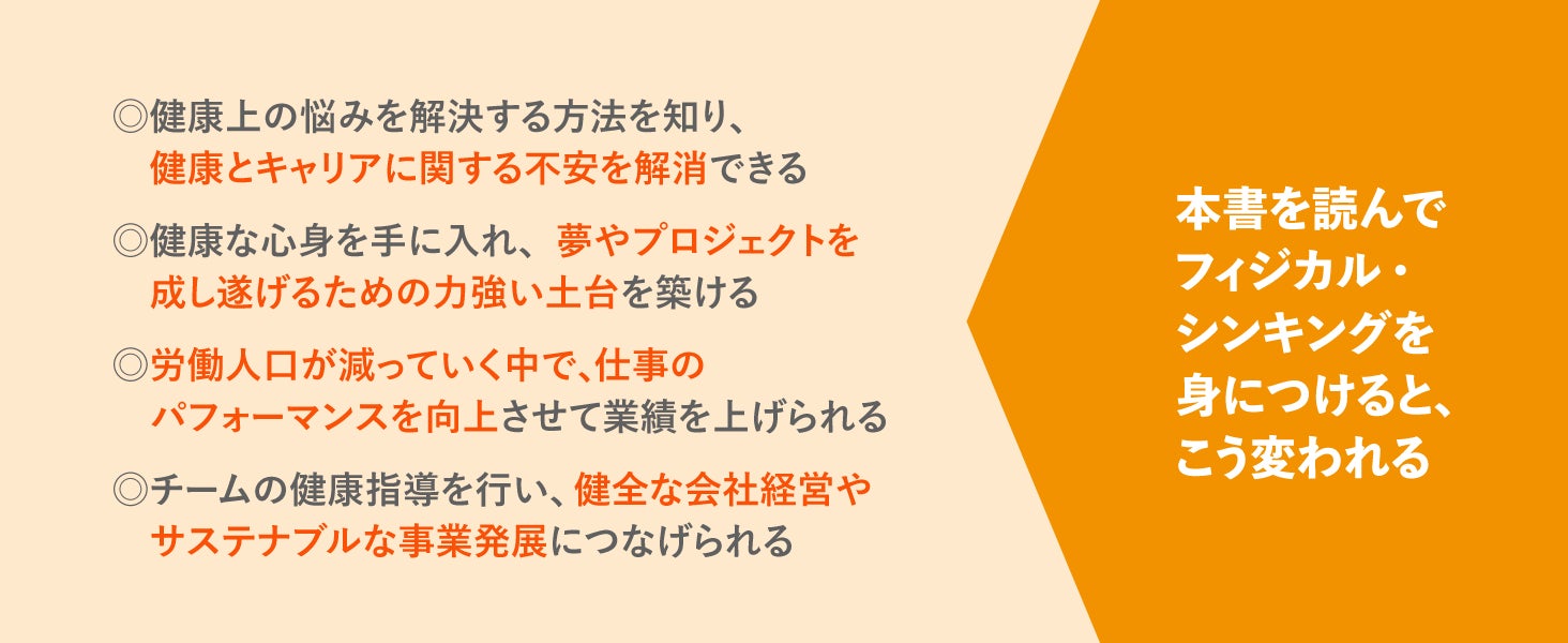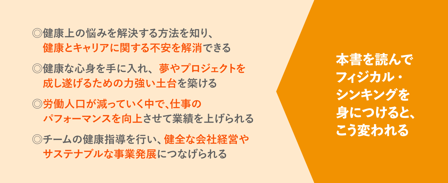 本書は、ウェルビーイングへの意識が強まり、健康経営の概念が注目される中で、ビジネスパーソンが今すぐ身につけるべき健康思考=フィジカル・シンキングについて分かりやすく学べる一冊です。