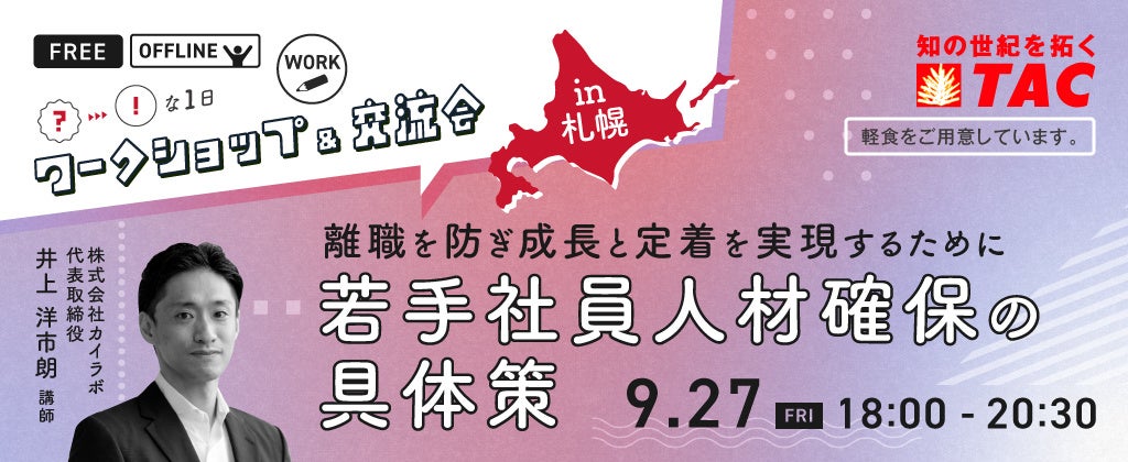 公認会計士や税理士など、多くの国家資格や検定試験の受験指導などの教育事業を展開しているTAC株式会社(東京都千代田区、代表取締役:多田敏男)は、法人向け人材教育部門から、人事・教育担当者に向けに「人事・教育担当者 ワークショップ&交流会 若手社員人材確保の具体策」を2024年9月27日(金)に実施します。