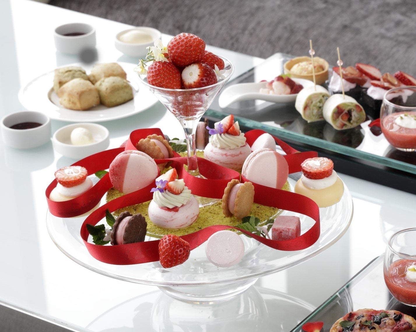 トップを飾る苺タルトとマカロンに、みずみずしいフレッシュ苺。グラスに重ねた苺のソルベやパンナコッタ、