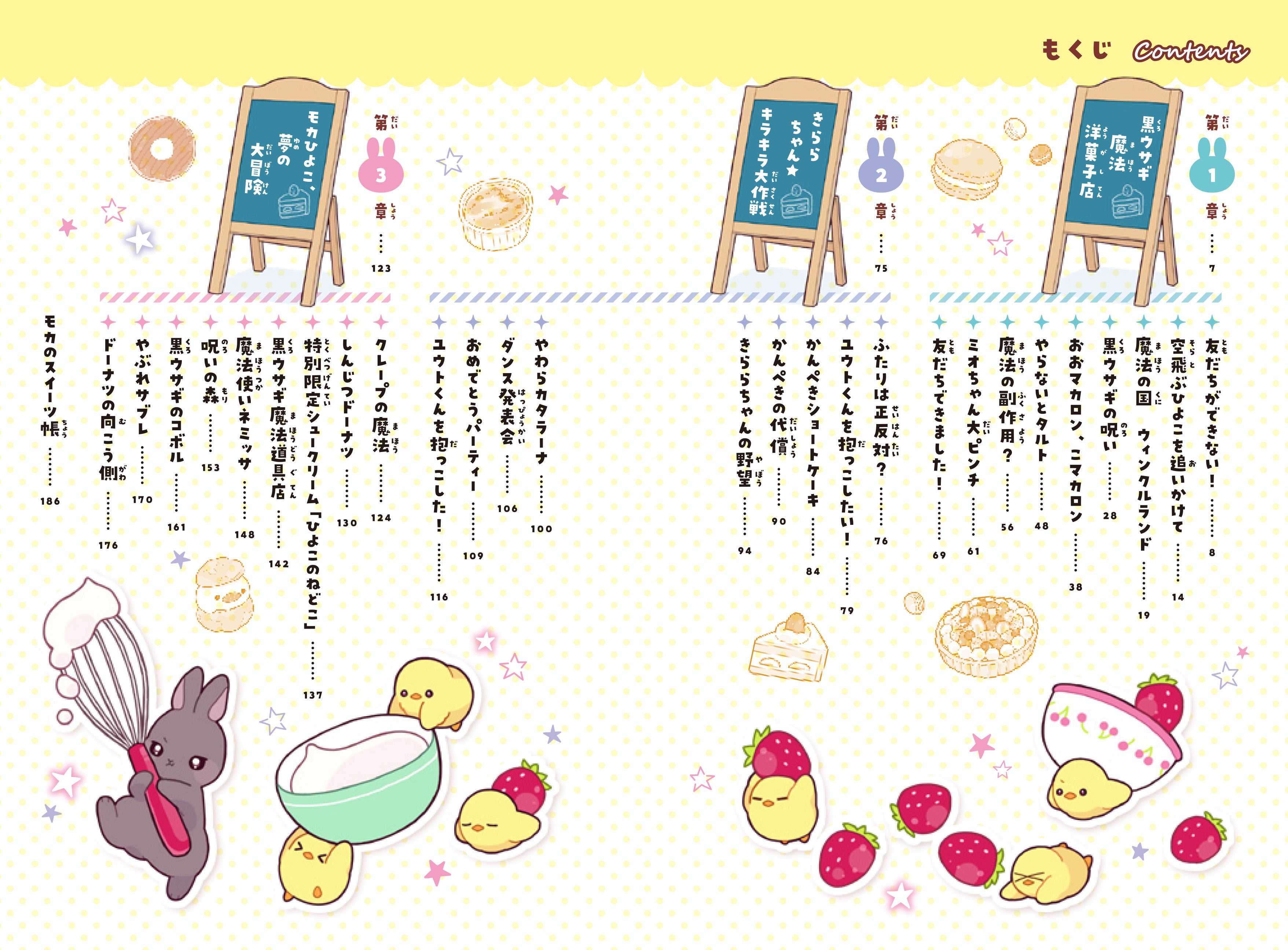 ユウトにかけられた呪いをとくために、ユウトといっしょに「黒ウサギ洋菓子店」の手伝いをすることになったモカ。お店で売る魔法のスイーツの効果で、いろいろな人を助けてポイントをためていきますが──。おいしくて、ふしぎなことが次々起こる楽しい物語。