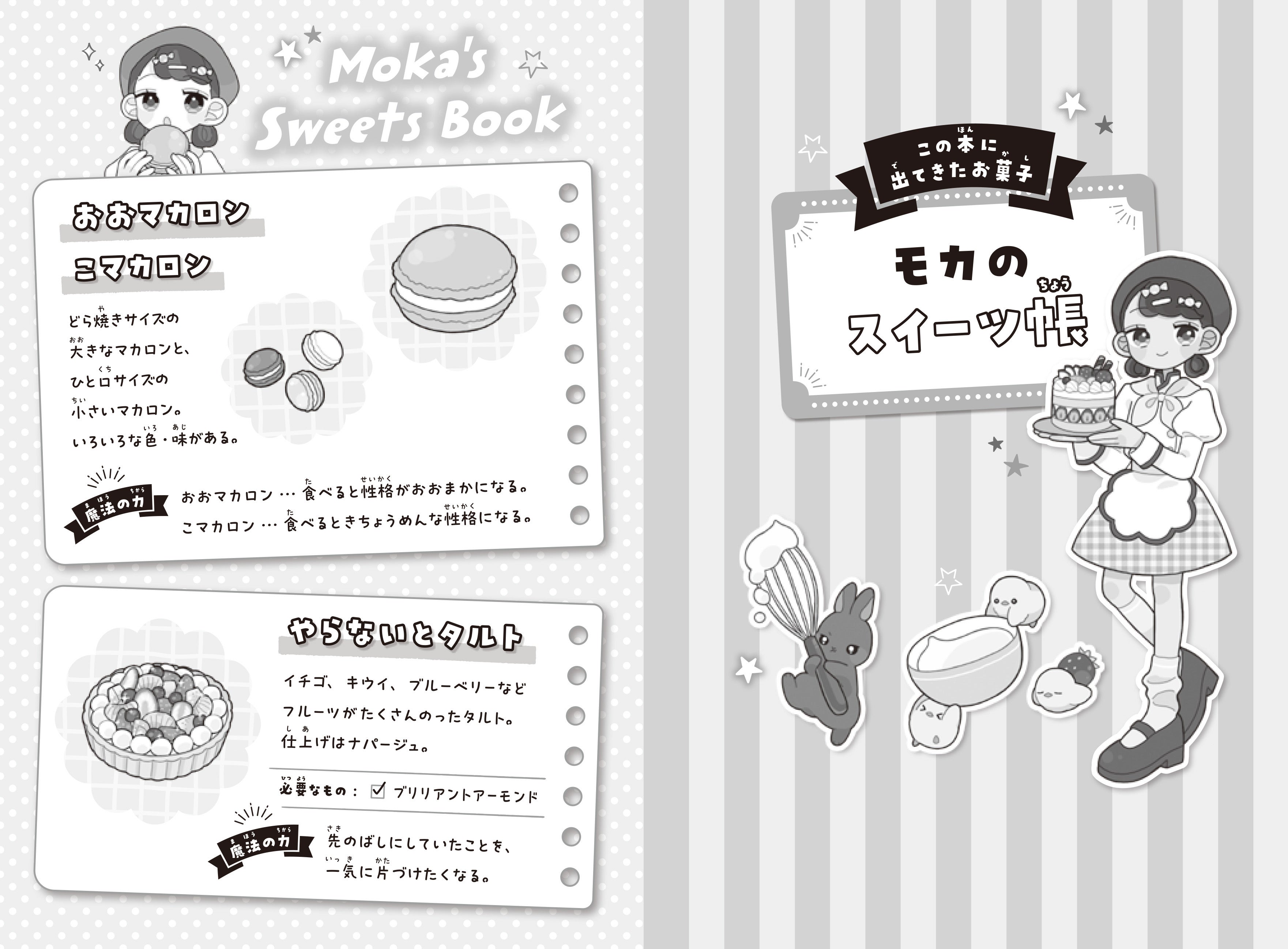 モカのパティシエ服姿や、黒ウサギ姿のユウトくん、さまざまな魔法のスイーツのイラスト等々をたっぷり堪能でき、パラパラと眺めるだけでも楽しくなる1冊です。