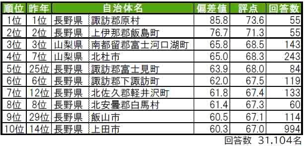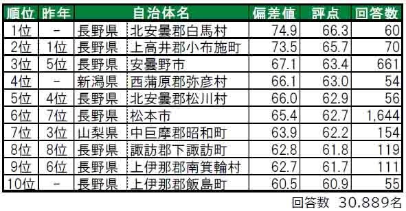 ●順位を上げてトップ10入りした自治体は、5位長野県諏訪郡富士見町(昨年25位)、7位長野県北佐久郡軽井沢町(昨年12位)、9位長野県飯山市(昨年29位)、10位長野県上田市(昨年14位)です。