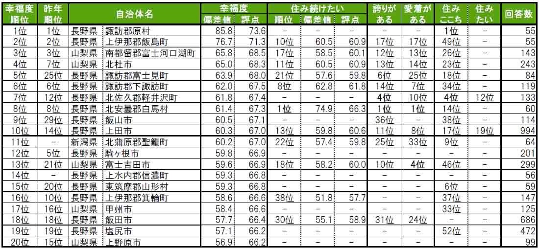 街の幸福度は2年連続で、1位長野県諏訪郡原村、2位長野県上伊那郡飯島町、3位山梨県南都留郡富士河口湖町。