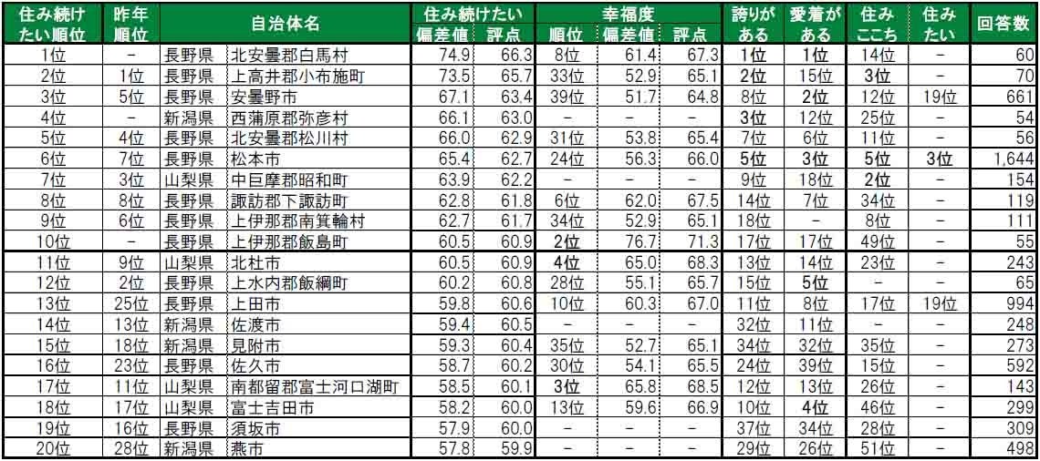 •1位諏訪郡原村、14位上水内郡信濃町、15位東筑摩郡山形村は、2020年~2024年の累計回答数が自治体が50名未満で、「住み続けたい」「誇りがある」「愛着がある」ランキングの集計対象外となっているため、「-」と表示しています。その他、「幸福度」「住み続けたい」「誇りがある」「愛着がある」ランキングの順位が「-」と表示されているものは、偏差値50未満のため「-」と表示しています。