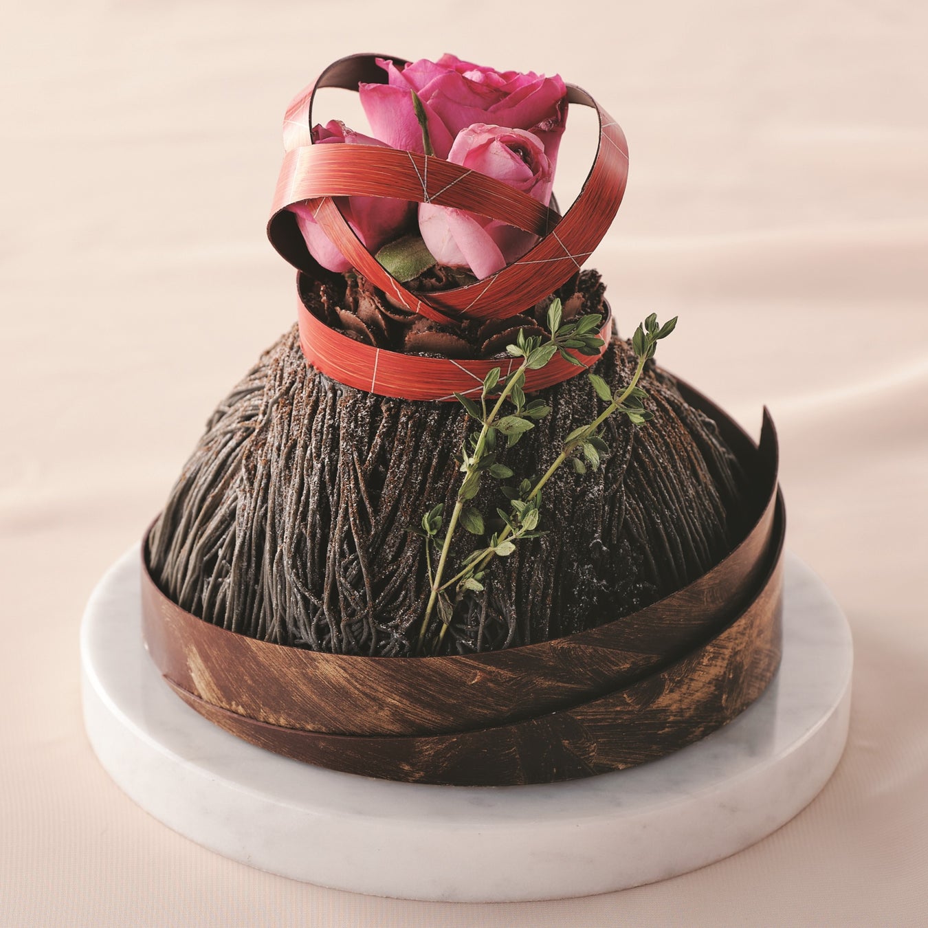 黒ビール香るビターなメレンゲを土台に、茨城県産和栗クリーム、エクアドル産ショコラクリームと薔薇で華やかに飾ったモンブラン。加賀棒茶や芳ばしく焼きしめた林檎で香り豊かに仕上げました。