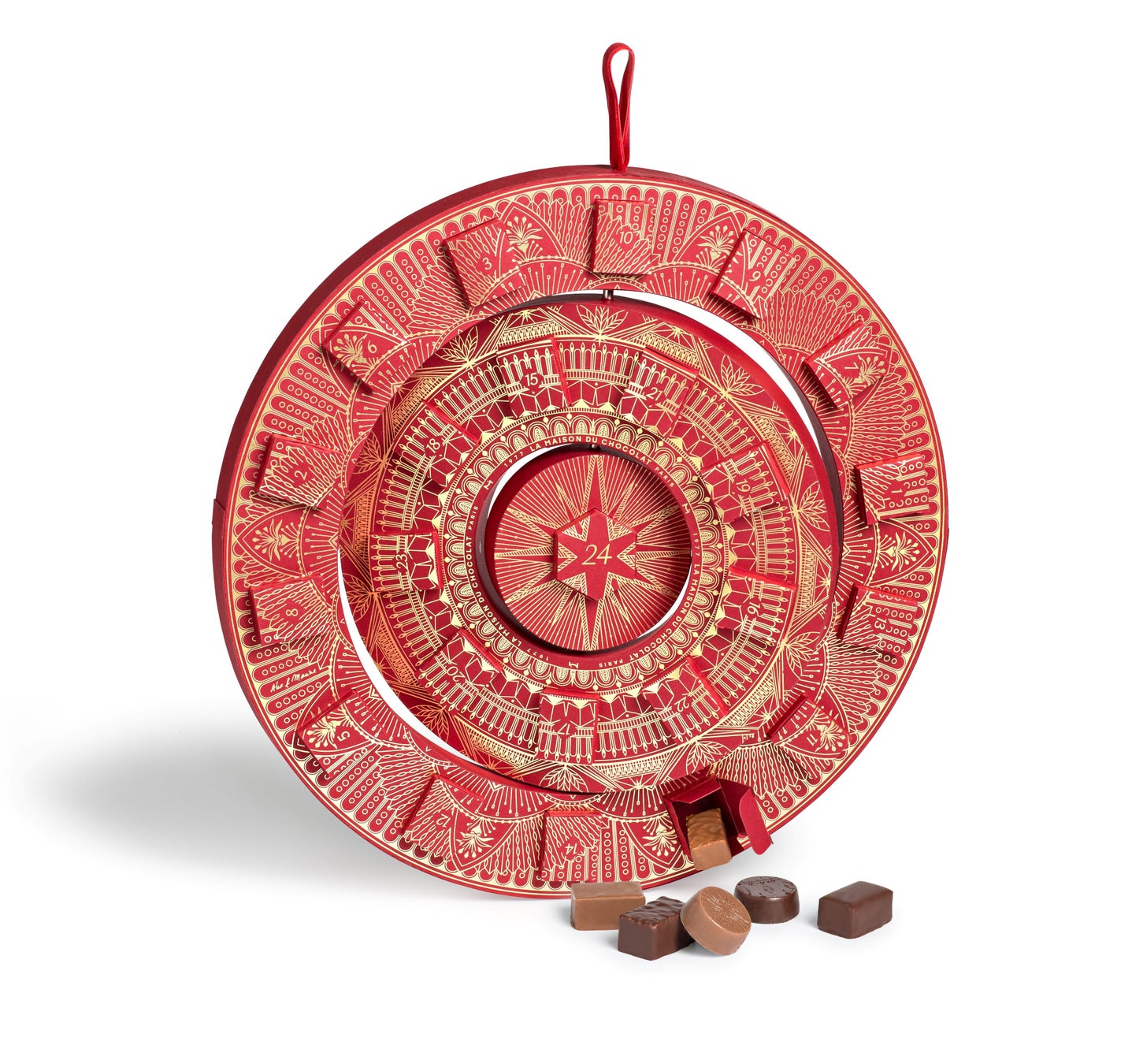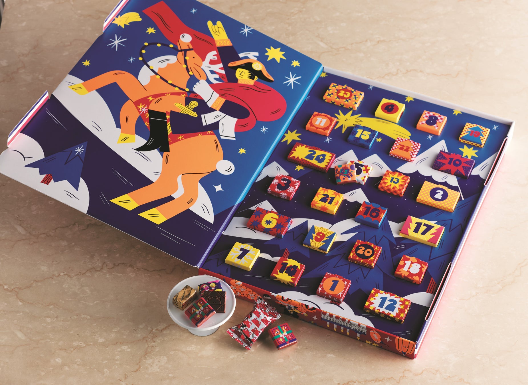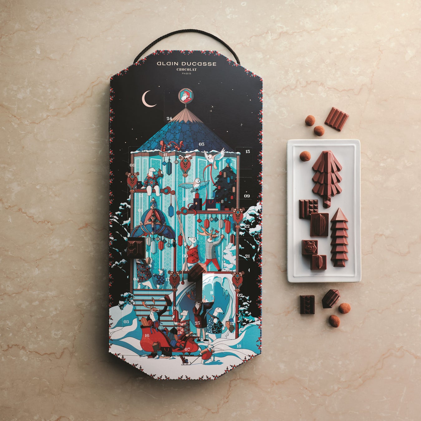 クリスマス仕様のフランス名所をえがいた特大アドベントカレンダー。遊び心あふれるデザインと21種類のチョコレートで心躍るカウントダウンをお届けします。