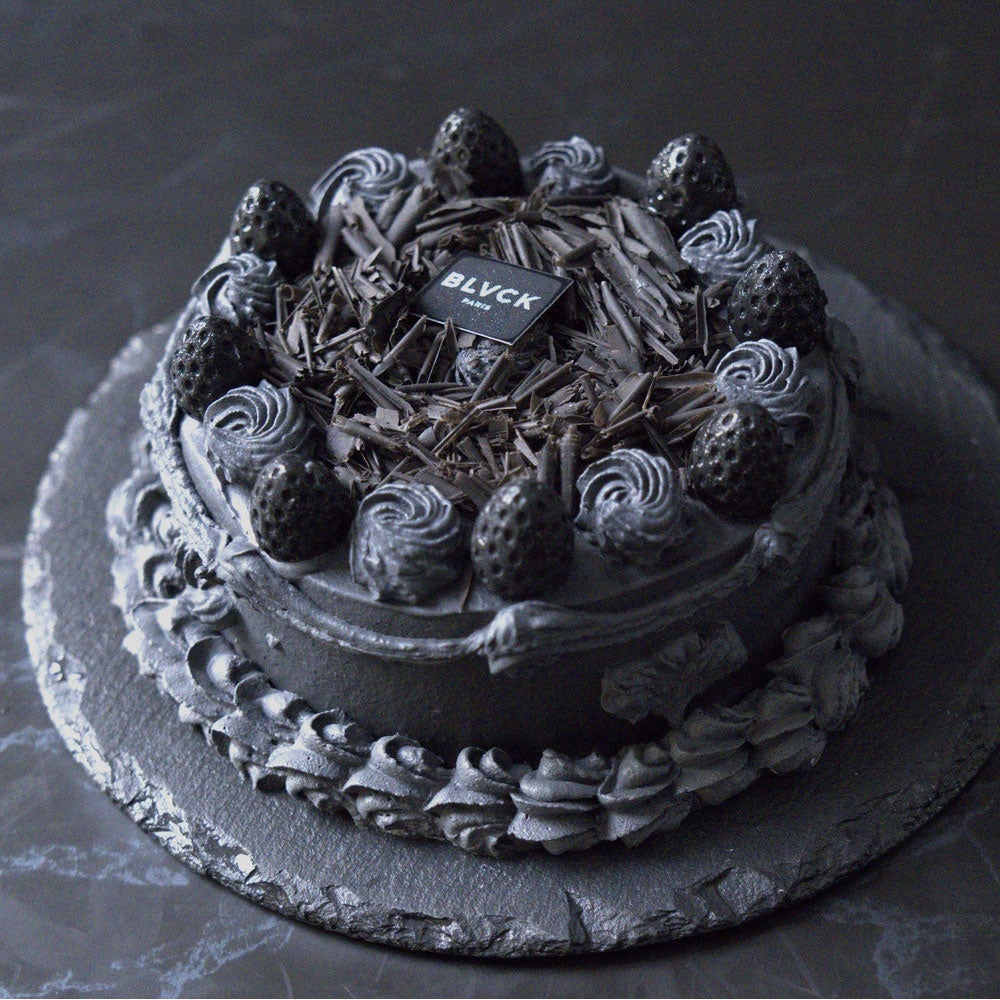 〈ブラックパリ〉が手掛ける「BLVCK CROWN CAKE」は、黒の美学を極めたインパクト大の真っ黒ショートケーキ。飾りも中のスポンジも黒で仕上げたこだわりよう。切り分けるといちごの赤が見える、モードでラグジュアリーなオールブラックケーキです。