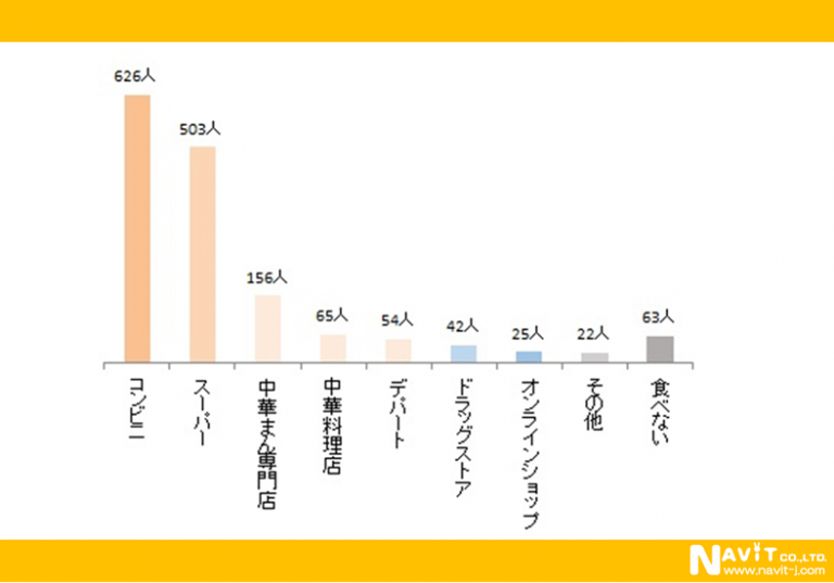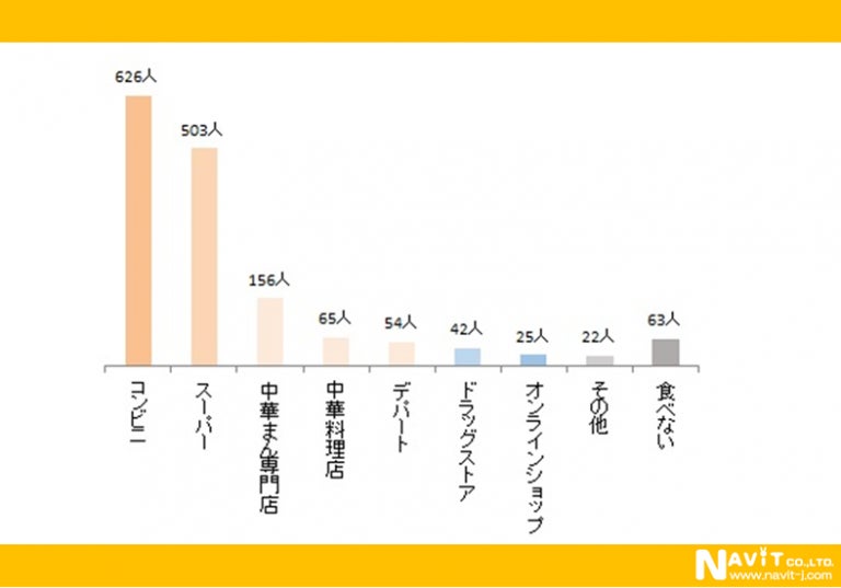 購入する場所は「コンビニ」626人と「スーパー」503人が飛びぬけて多かったです。「中華まん専門店」は166人とトップ2に比べ少なめですが、根強いファンのあることを示す数字です。