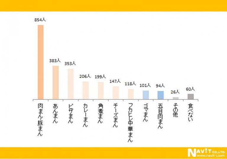 好きな中華まんを答えてもらったところ、トップは「肉まん・豚まん」で、854人。次いで多かったのは「あんまん」383人、「ピザまん」353人、「カレーまん」206人などでした。