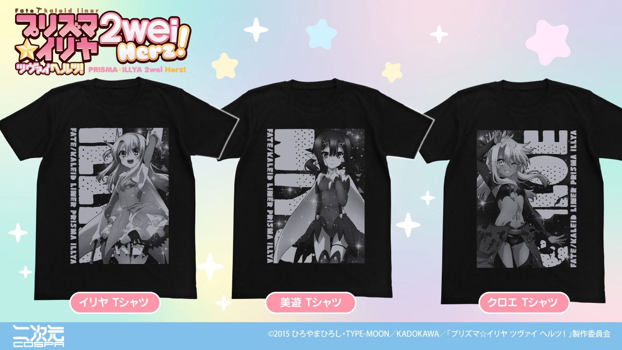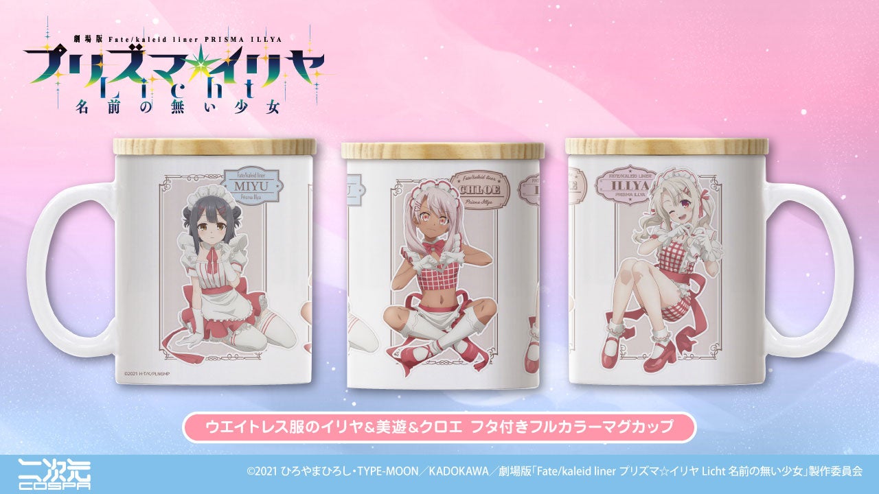『Fate/kaleid liner プリズマ☆イリヤ』シリーズより、イリヤ、美遊、クロエの「Tシャツ」をはじめ、華やかな衣装を身に纏った三人と一息つける「フタ付きフルカラーマグカップ」など、二次元コスパから新グッズが登場です。
