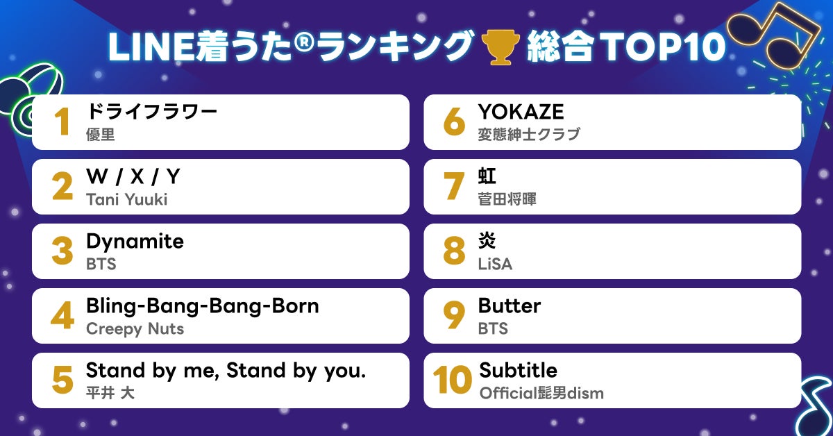LINE電話の着信音・呼出音着を好きな音楽でカスタマイズできる機能「LINE着うた®︎」にて、最も着うたに設定された楽曲を1位から10位までのランキングで振り返ります。