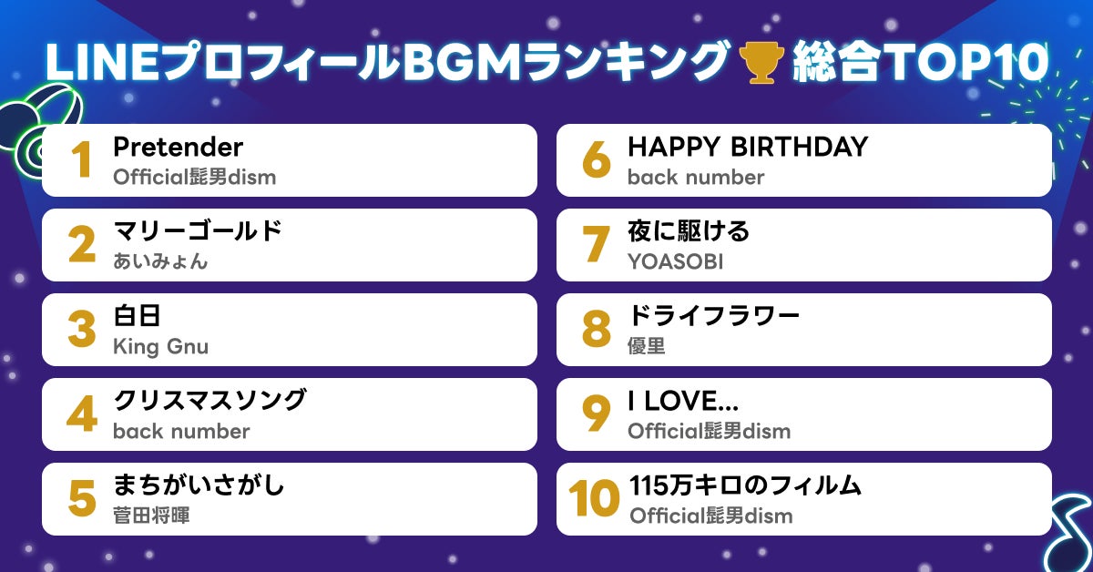LINEのプロフィール画面にBGMとして好きな曲を設定できる機能「LINEプロフィールBGM」にて、最もBGMに設定された楽曲を1位から10位までのランキングで振り返ります。