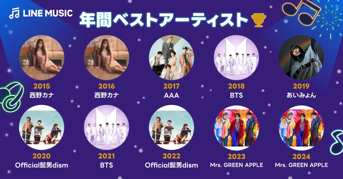 LINE MUSICで2015年からの各年に最も再生された「アーティスト」を振り返ります。リアルな恋愛観を綴った歌詞と透明感のある歌声でファンを魅了する西野カナ(2015年・2016年)をはじめ、圧倒的なパフォーマンスと歌唱力で世界中を魅了するBTS(2018年・2021年)、さまざまなジャンルをルーツとした音楽で全世代から支持を集め続けているOfficial髭男dism(2020年・2022年)、数々の名曲を生み出し国民的人気を誇るMrs. GREEN APPLE(2023年・2024年)など、音楽シーンをけん引したアーティストたちがベストアーティストに輝きました。