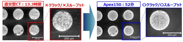 100mm×240mmの大形の基盤を、従来のSigray社製直交型CT装置と、“ApexXCT-150”にて測定した事例。S/N比の向上により、クラックが明瞭に可視化できている。また、測定時間も約15倍短縮できている。