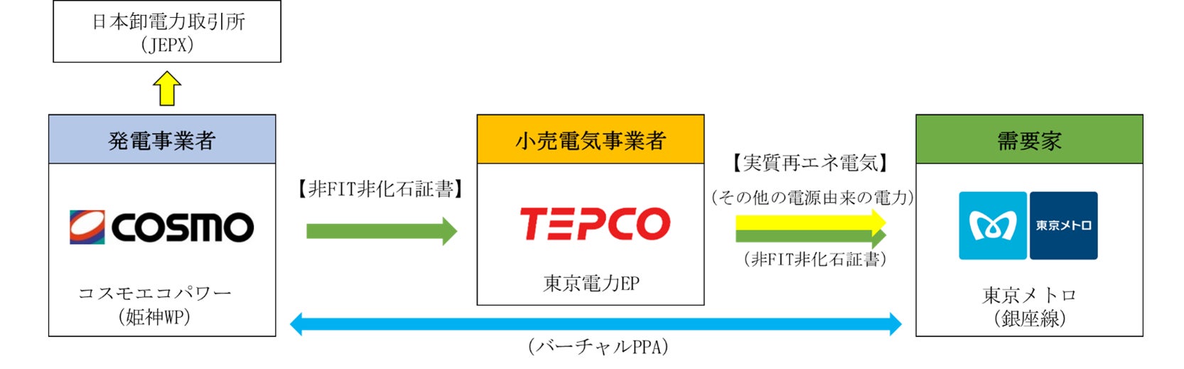 東京地下鉄株式会社(本社:東京都台東区、代表取締役社長:山村 明義、以下「東京メトロ」)、コスモエネルギーホールディングス株式会社(代表取締役社長:山田 茂)のグループ会社であるコスモエコパワー株式会社(本社:東京都品川区、代表取締役社長:野地 雅禎、以下「コスモエコパワー」)、東京電力エナジーパートナー株式会社(本社:東京都中央区、代表取締役社長:長﨑 桃子、以下「東京電力EP」)は、2024年9月27日付で、陸上風力を活用したバーチャルPPA(非FIT発電設備※1における発電に係る環境価値の提供に関する契約、以下「本PPA」)を締結しました。