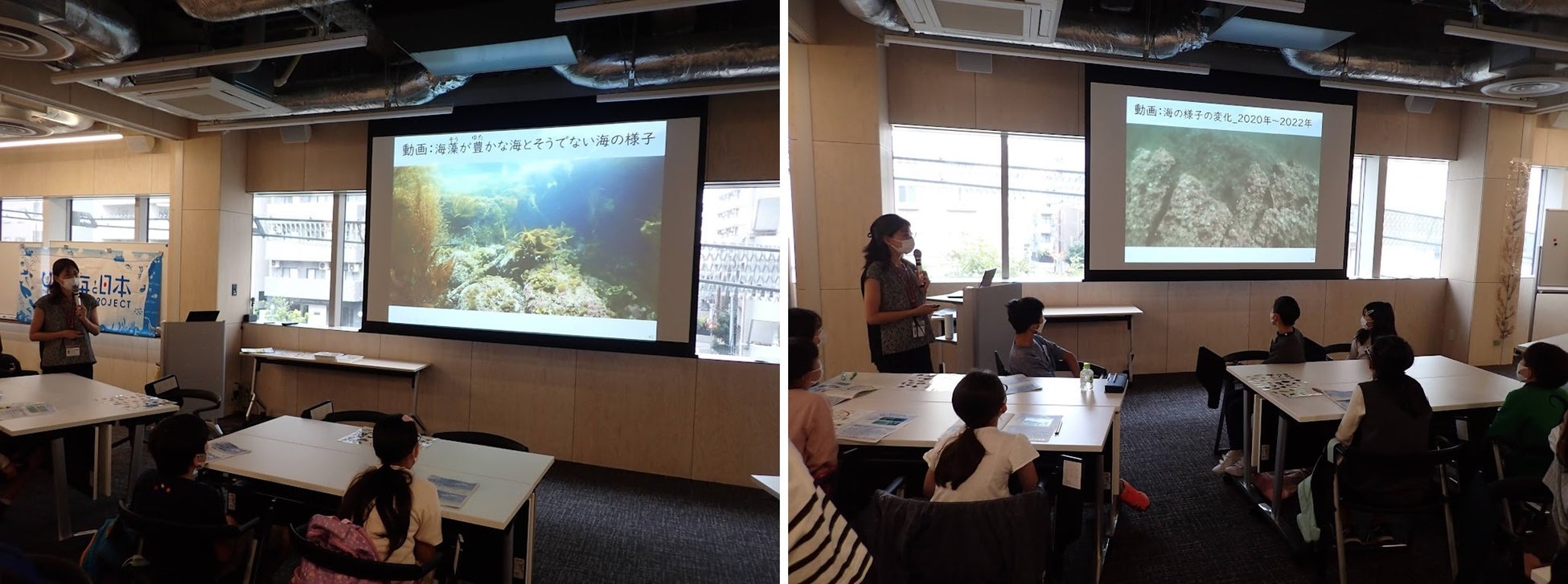 しかし、いまと同じようには食べられなくなるかもしれない、近年話題となっている海の環境問題「磯焼け」現象についてお話しました。「磯焼け」とは、海藻の集まりである藻場がなくなったり減ったりしてしまうことです。子どもたちは藻場が豊かな海と、磯焼けしている海の様子の動画を見てその違いを確かめ、藻場が海の生き物や環境にとって大事な役割をしていると知ることができました。さらに藻場再生に取り組む企業の事業やNPO法人の取り組みについても触れ、今後、自分たちにできることは何かを考えるきっかけになりました。