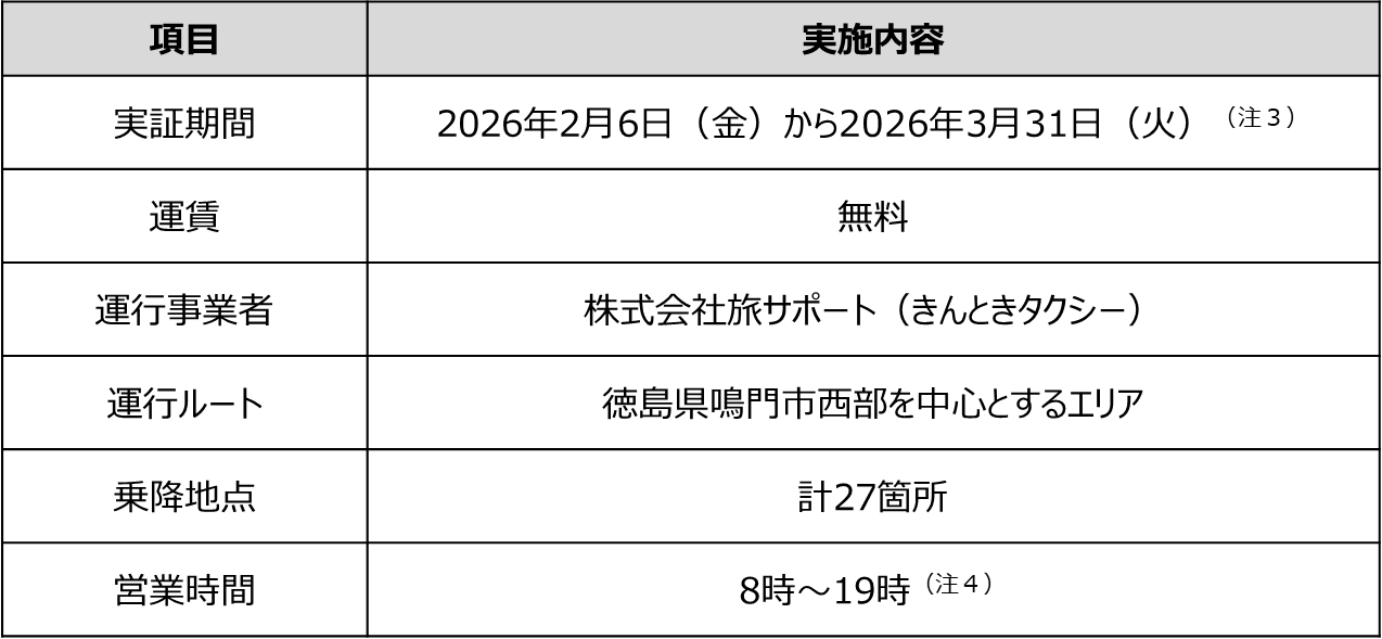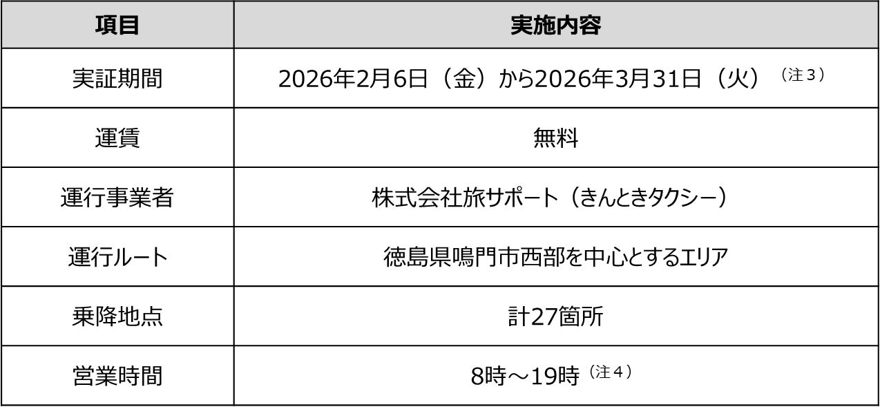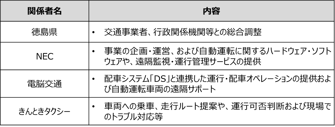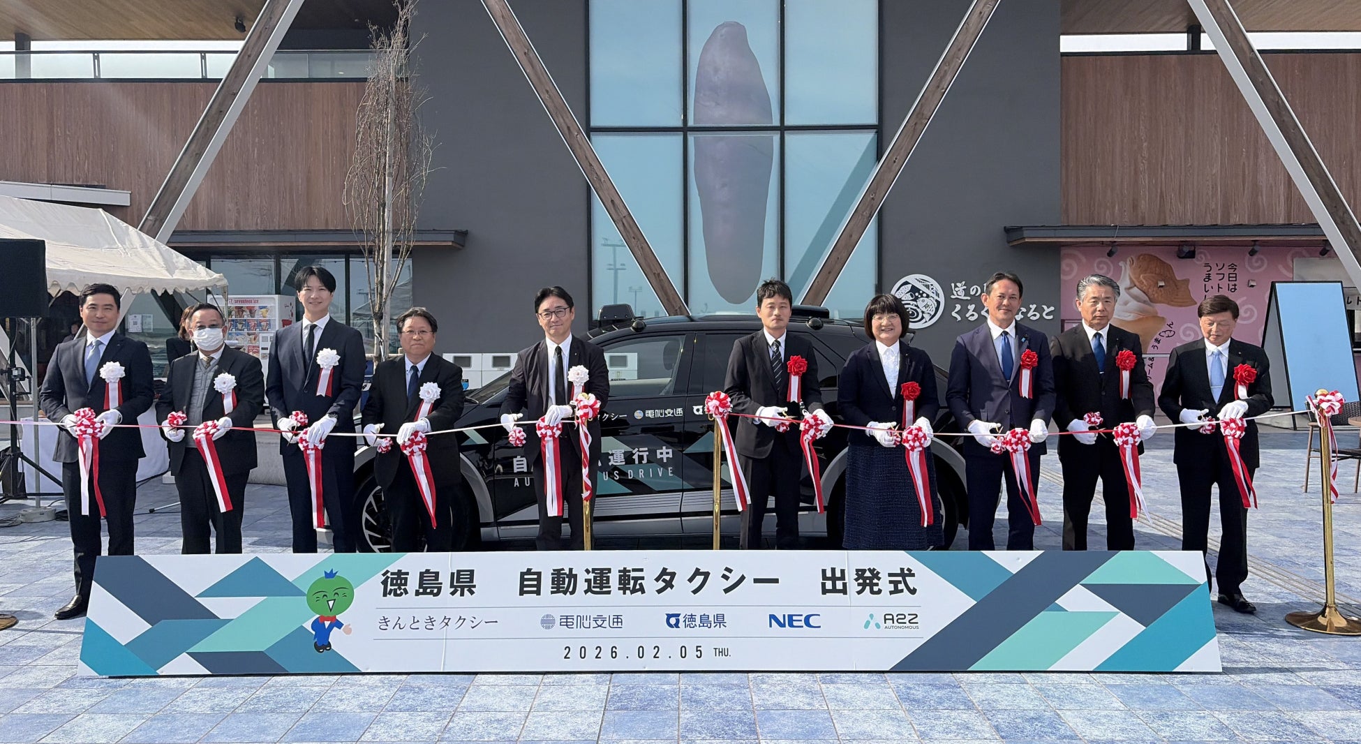 徳島県(知事:後藤田 正純)、日本電気株式会社(本社:東京都港区、取締役 代表執行役社長 兼CEO:森田隆之、以下「NEC」)、株式会社電脳交通(本社:徳島県徳島市、代表取締役社長:近藤 洋祐、以下「電脳交通」)、株式会社旅サポート(本社:徳島県鳴門市、代表取締役:山室 真一、以下「きんときタクシー」)は徳島県鳴門市西部を中心とするエリアで自動運転タクシーの実証運行を本日から2026年3月31日(火)まで実施します。