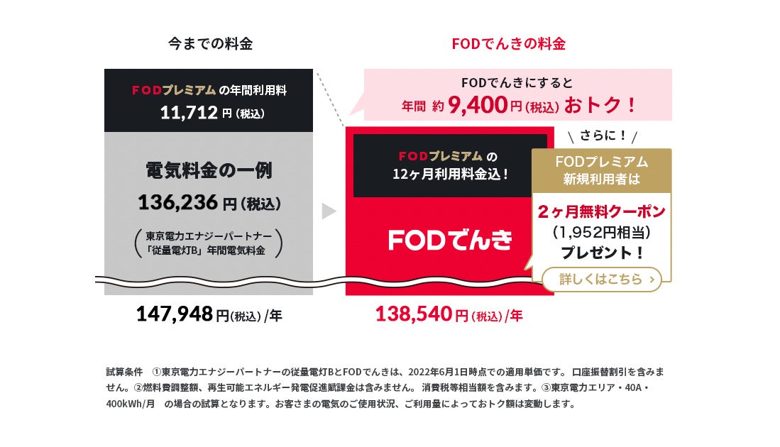 【フジテレビ】電気料金と「FODプレミアム」料金がセットで年間費用がお得になる電気料金メニューが登場!「FODでんき」さらに、FODプレミアム新規利用者には2ヵ月無料クーポンをプレゼント!