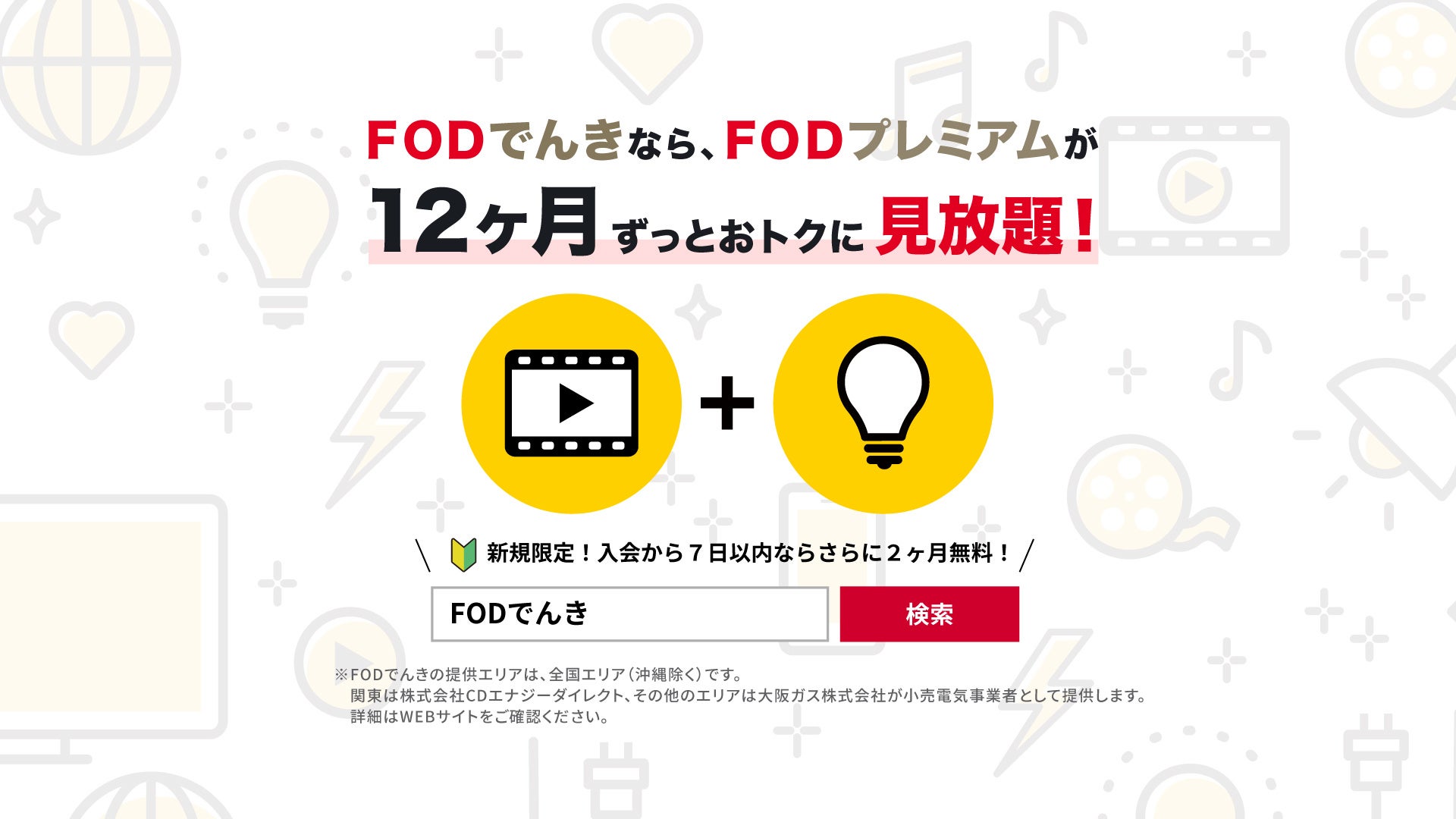 FODは、人気ドラマ、アニメ、映画など様々な作品ラインナップを揃えております。生活インフラのひとつである電気とエンターテインメントがセットでお得な「FODでんき」により、よりお客様の生活に根付いたかたちで楽しんでいただけるようサービスの充実に努めてまいります。