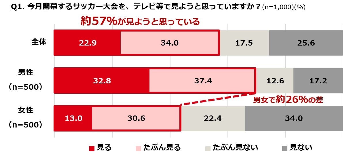 ・今月開幕のサッカー大会を見ようと思っている人は約57%、男性が70%に対し女性は44%に。