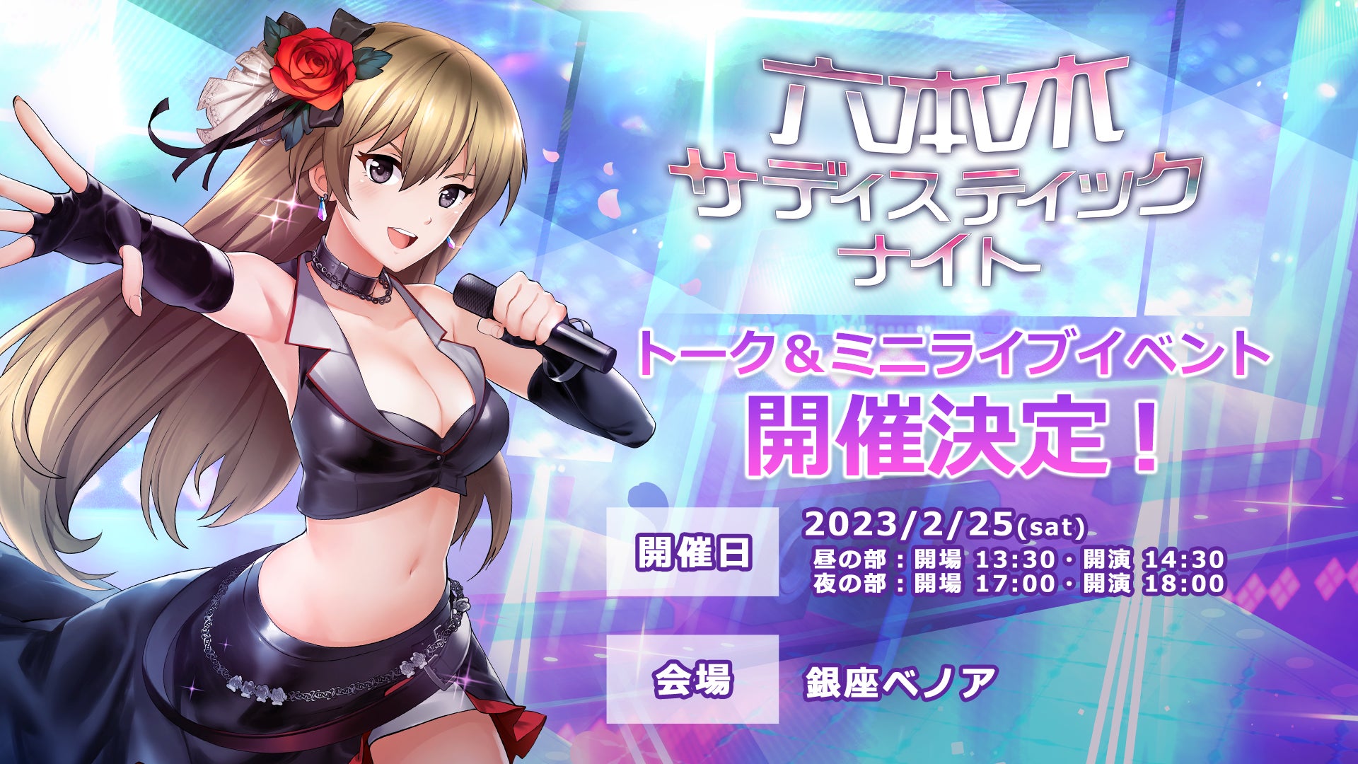チケットは1月28日(土)より一般販売を開始しました。 「六本木サディスティックナイト」 初となる声優イベントに足をお運びいただき、この日限りのスペシャルトーク&ミニライブをお楽しみください。