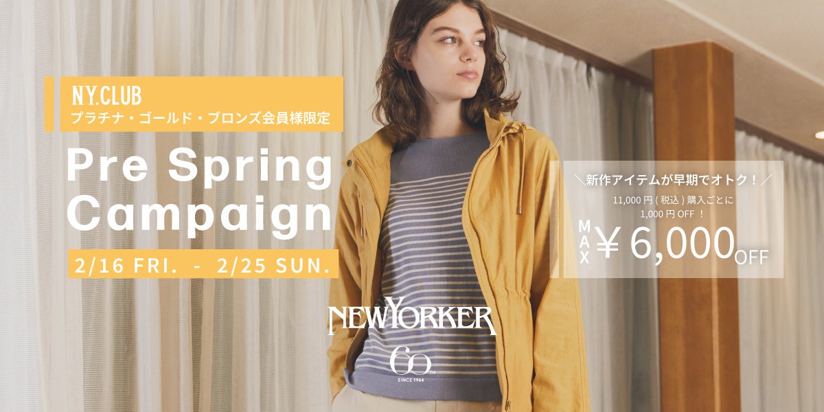 全国の二ューヨーカーウィメンズショップでは、日頃の感謝を込めまして、「NY.CLUB」プラチナ・ゴールド・ブロンズのVIP会員様限定で、春物新作アイテムがお得になる60周年プレスプリング キャンペーンを開催いたします。会期中、ニューヨーカーウィメンズの春物新作商品を税込11,000円ご購入ごとに1,000円OFF、ニューヨーカーブランド60周年を記念して最大で税込66,000円のご購入で6,000円OFFとさせていただきます。