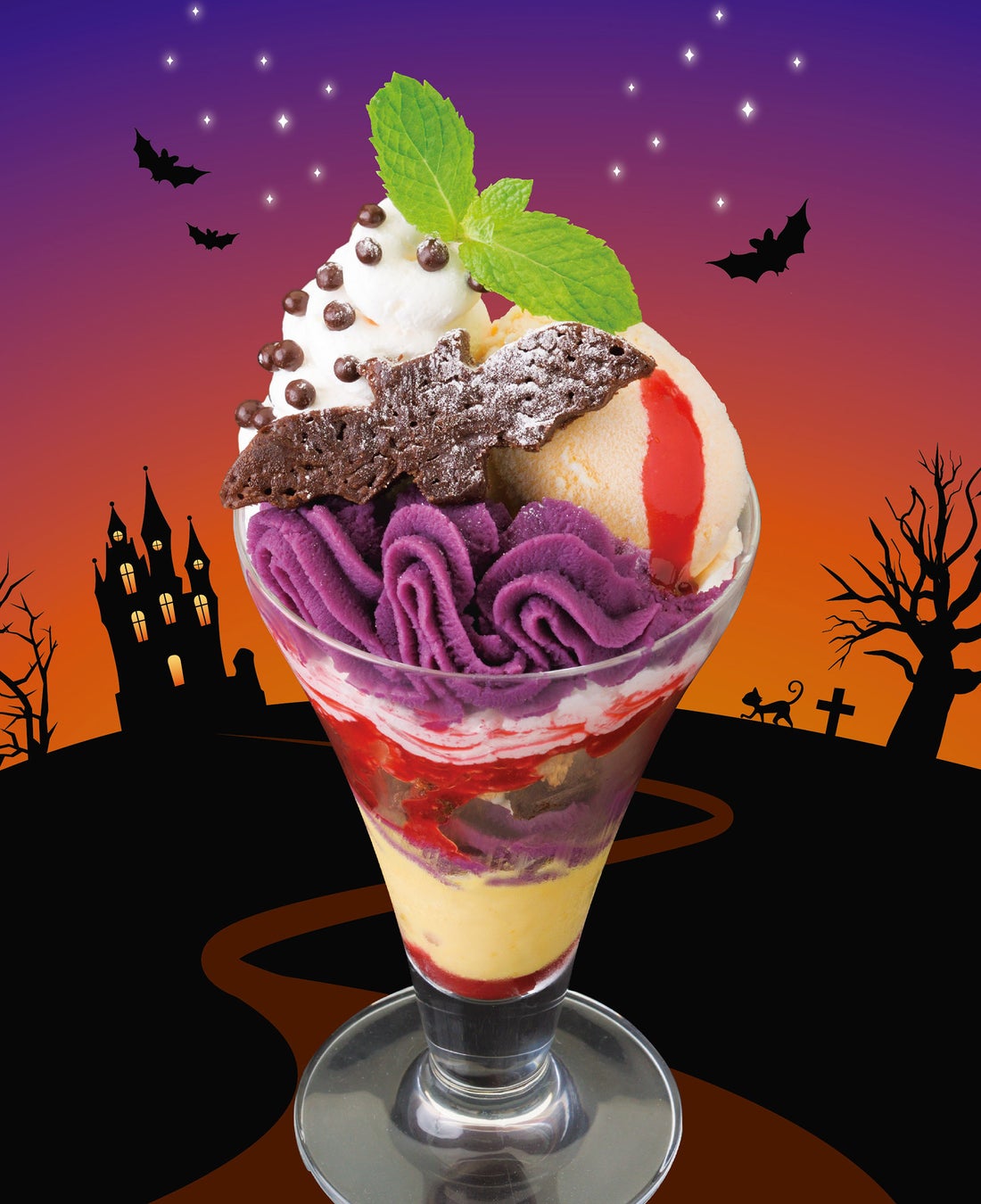 豊かな味わいの北海道産かぼちゃを使ったアイスクリームや、鮮やかな濃紫色が印象的な紫いものクリーム、バニラアイスなどを重ね、真っ赤なラズベリーソースをたらり。上面には、真っ黒なコウモリをイメージしたチョコブラウニーを飾り、ハロウィンのダーク&ホラーな世界観をマジカルな色合いで表現しました。