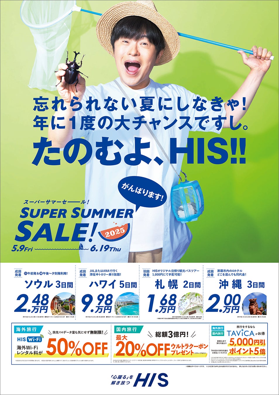 株式会社エイチ・アイ・エス(本社:東京都港区 以下、HIS)は、2025年5月9日(金)~6月19日(木)の期間限定で、「SUPER SUMMER SALE! 2025」を開催します。