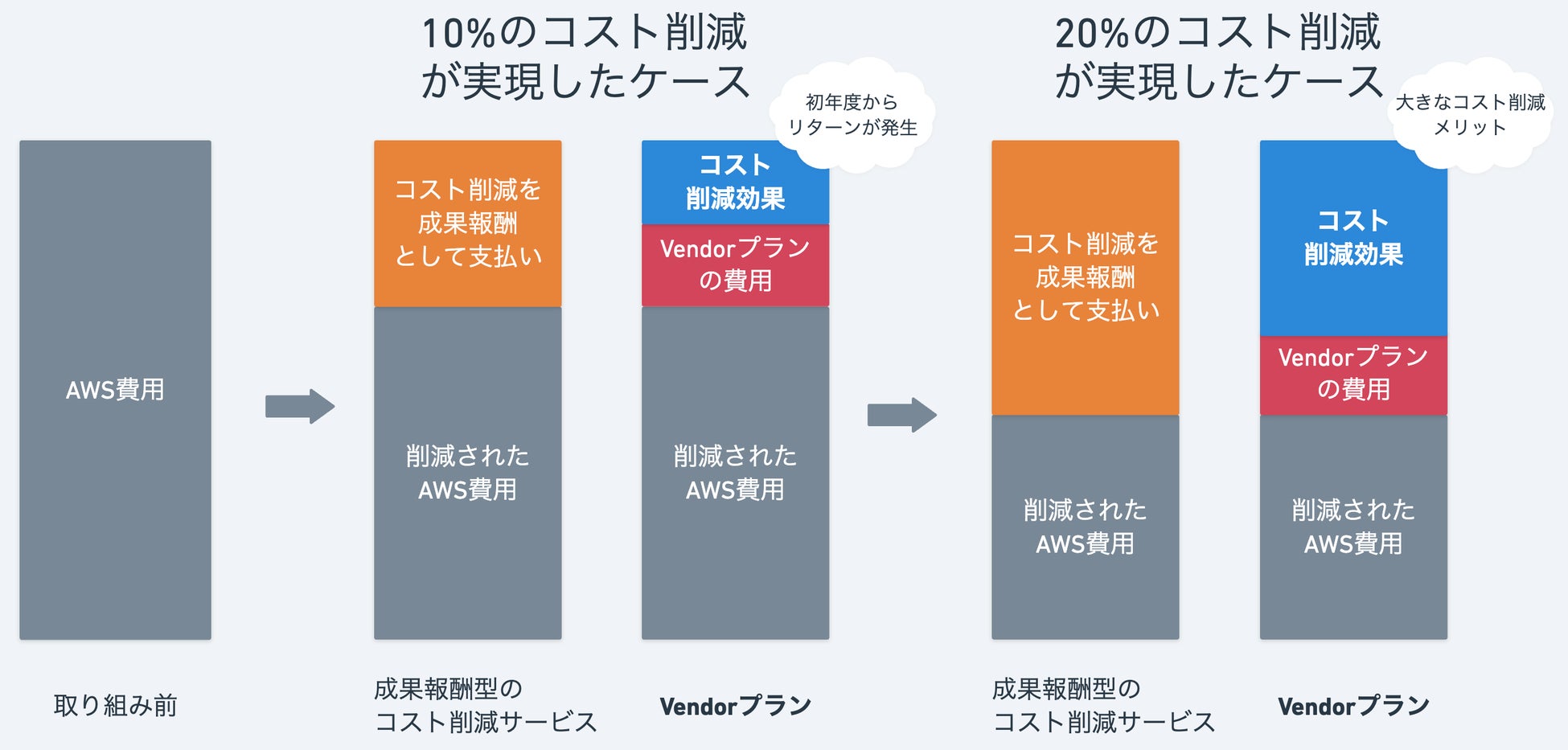 「Vendorプラン」は、コスト削減額が契約時の支払い費用に満たなかった場合に返金します。プロジェクトの結果、万が一、コストが削減されなかった場合も返金対象となるため、ユーザーはリスクを負わずに利用できます。