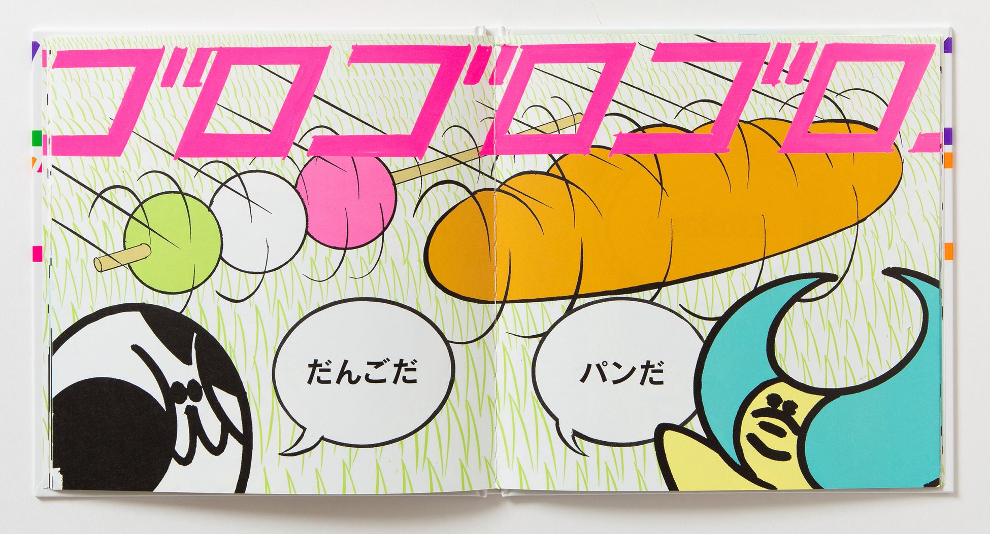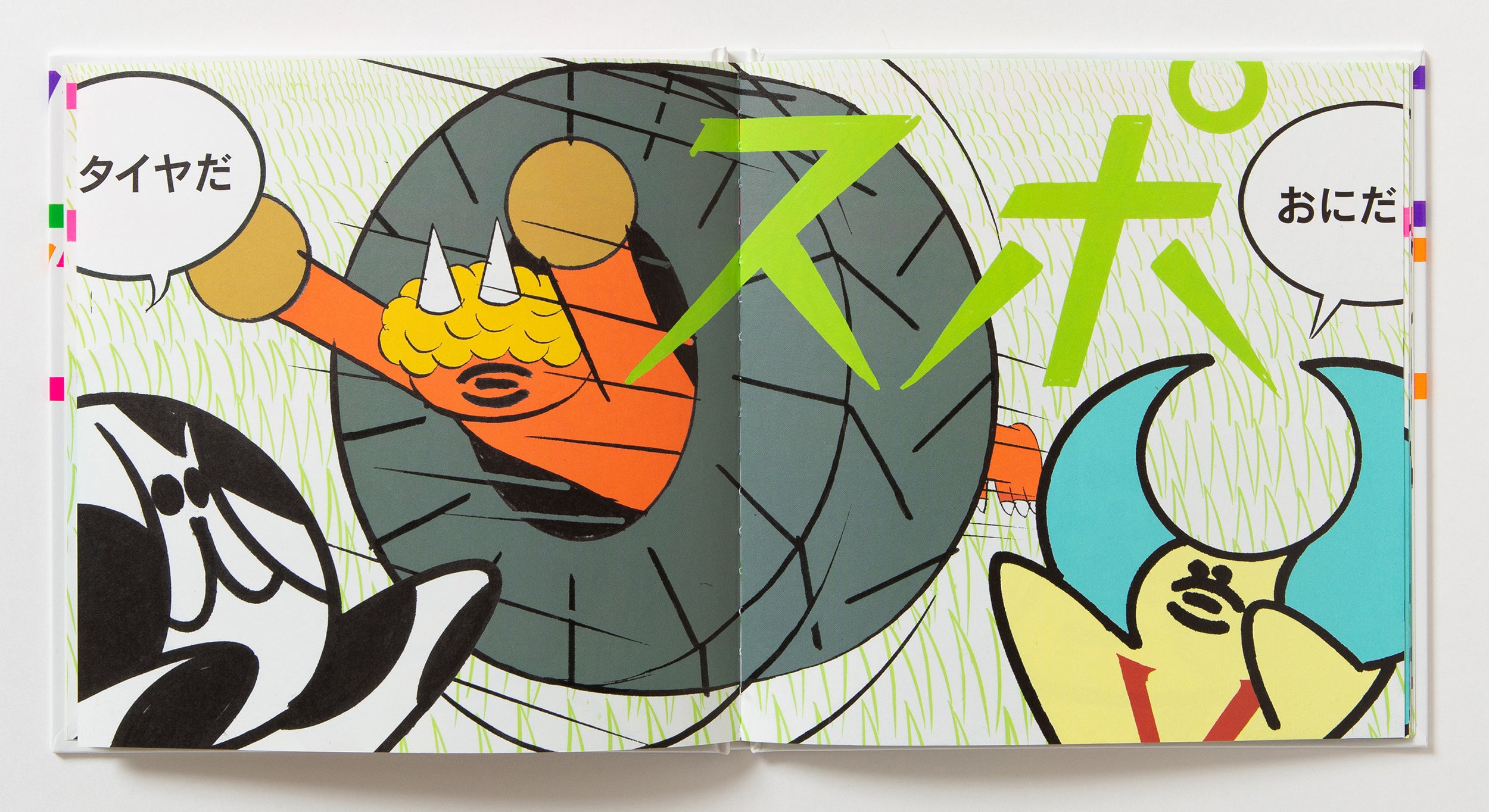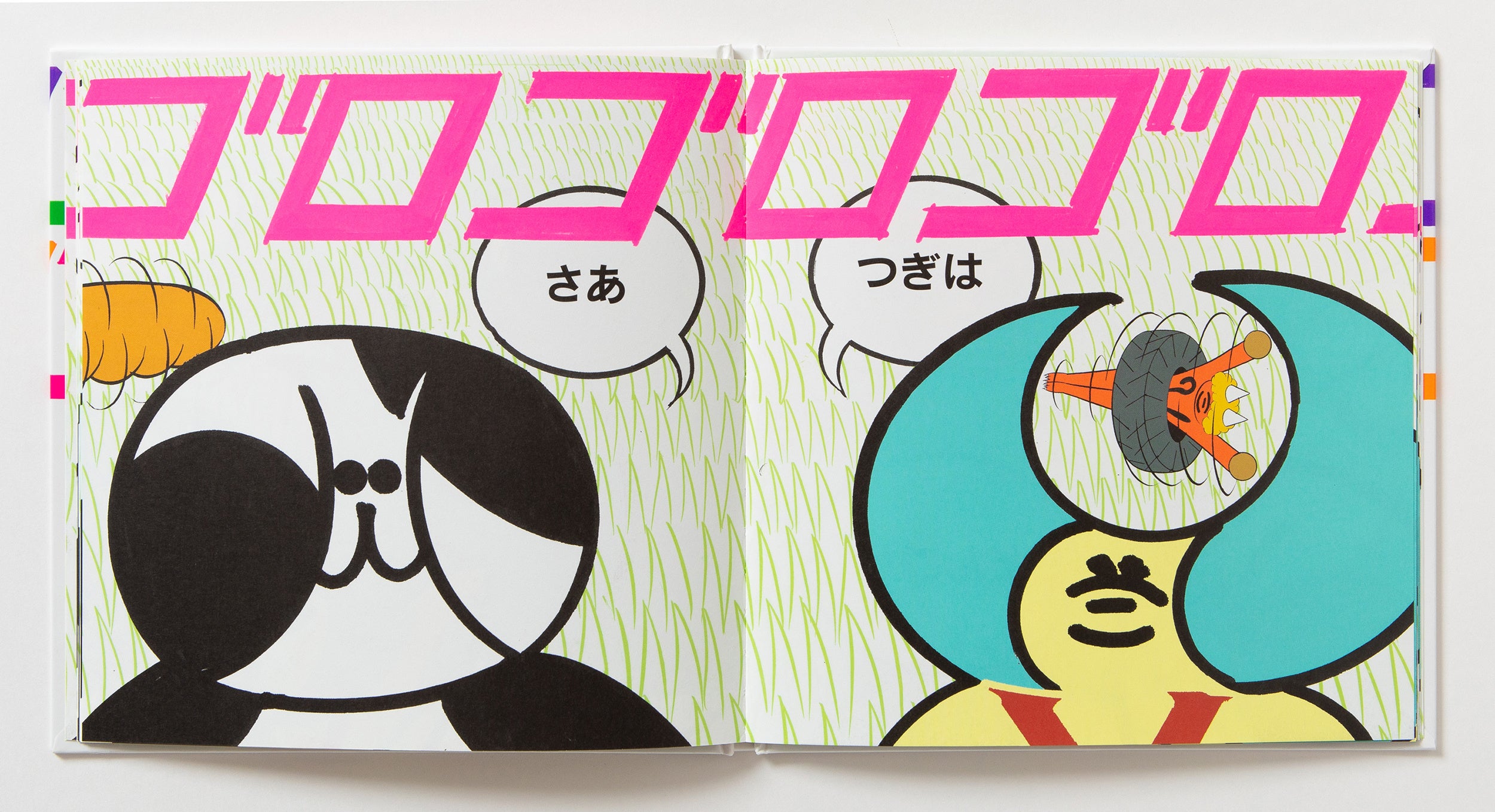 日本のビジュアルアーティスト/漫画家である横山裕一は、「ネオ漫画」と呼ばれる実験的な表現や、時間の流れを独自の方法で描き出す作風により、オルタナティブ・コミックスの分野で広く知られています。『ゴロゴロゴロゴロ なんのおと?』では、横山の創作における重要なテーマのひとつである「音」を題材に、子どもたちとともにその世界を探求しています。タイポグラフィとリズムを遊び心たっぷりに用いながら、さまざまな音とその振動をグラフィカルに表現しています。本作は、オノマトペが持つ視覚的な力を通して、ドローイングが生み出すリズム感へと迫る、きわめて独創的な試みとなっています。