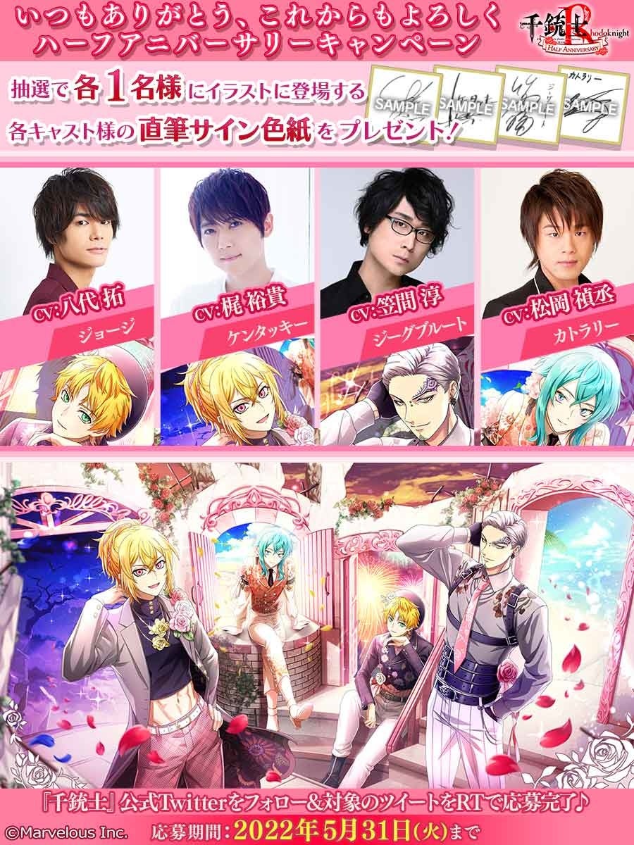 株式会社マーベラス(代表取締役社長 許田周一/所在地:東京都品川区)による、『千銃士』プロジェクトの完全新作スマートフォンゲーム『千銃士:Rhodoknight』(読み:せんじゅうし ろーどないと 以降、『千銃士R』)は、本日ハーフアニバーサリーを迎えました。それを記念してキャンペーン第4弾を開始し、新たなキービジュアルを初公開しました。開催中のストーリーイベントにあわせて、イベント内で活躍する★3「ジョージ(CV:八代拓)」と★3「ケンタッキー(CV:梶裕貴)」と★3「ジーグブルート(CV:笠間淳)」と★3「カトラリー(CV:松岡禎丞)」の新カードがピックアップで登場する期間限定ガチャを開催いたします。こちらのガチャは★3カードの出現率が2倍のフェス対象ガチャとなっております。ローズストーン300個がもらえる当日ログインボーナスも開催中です。Twitterではハーフアニバーサリーを記念して、出演声優の直筆サイン色紙が当たるTwitterキャンペーンも開催中です。また、千銃士Rとして初となるLINEスタンプの販売が決定いたしました。
