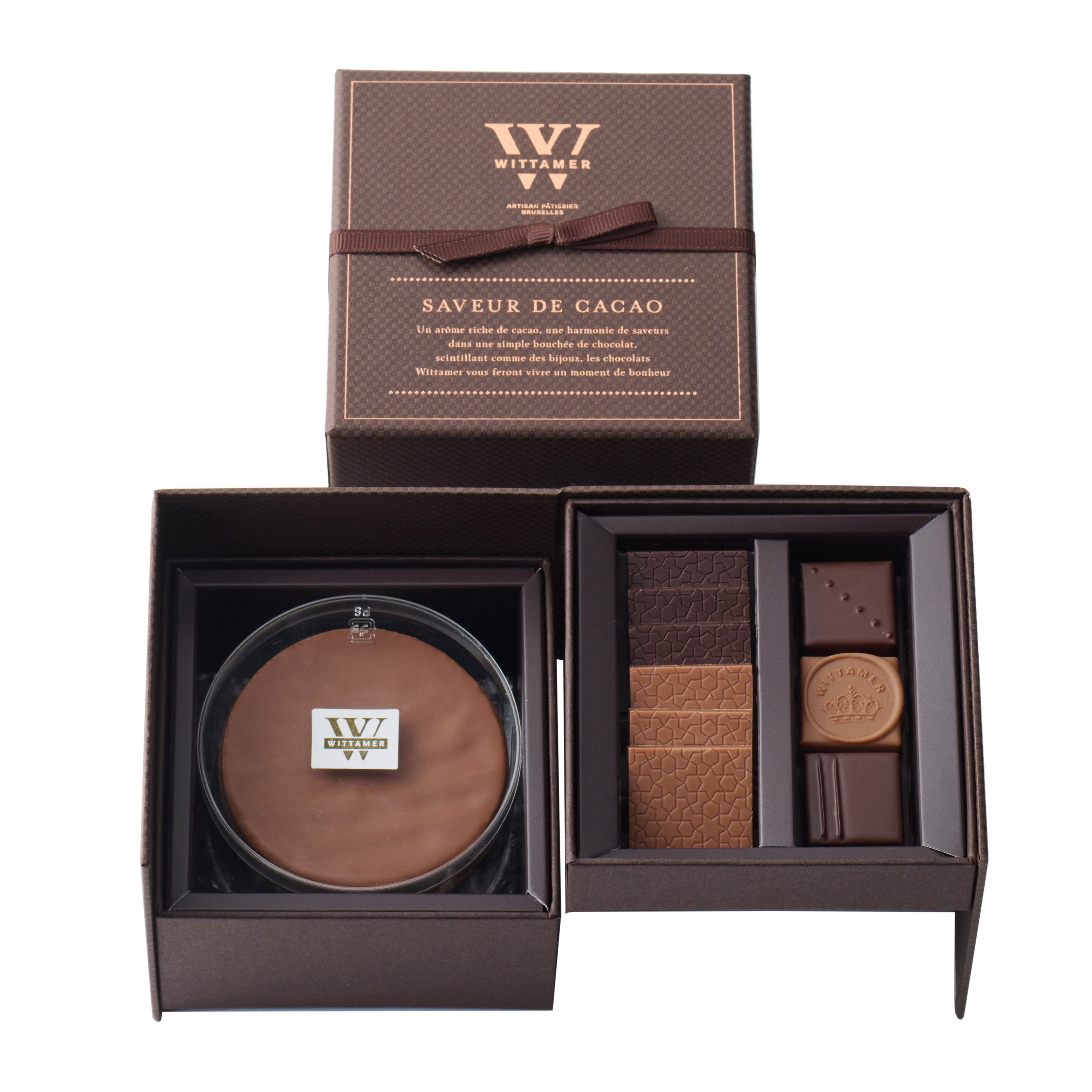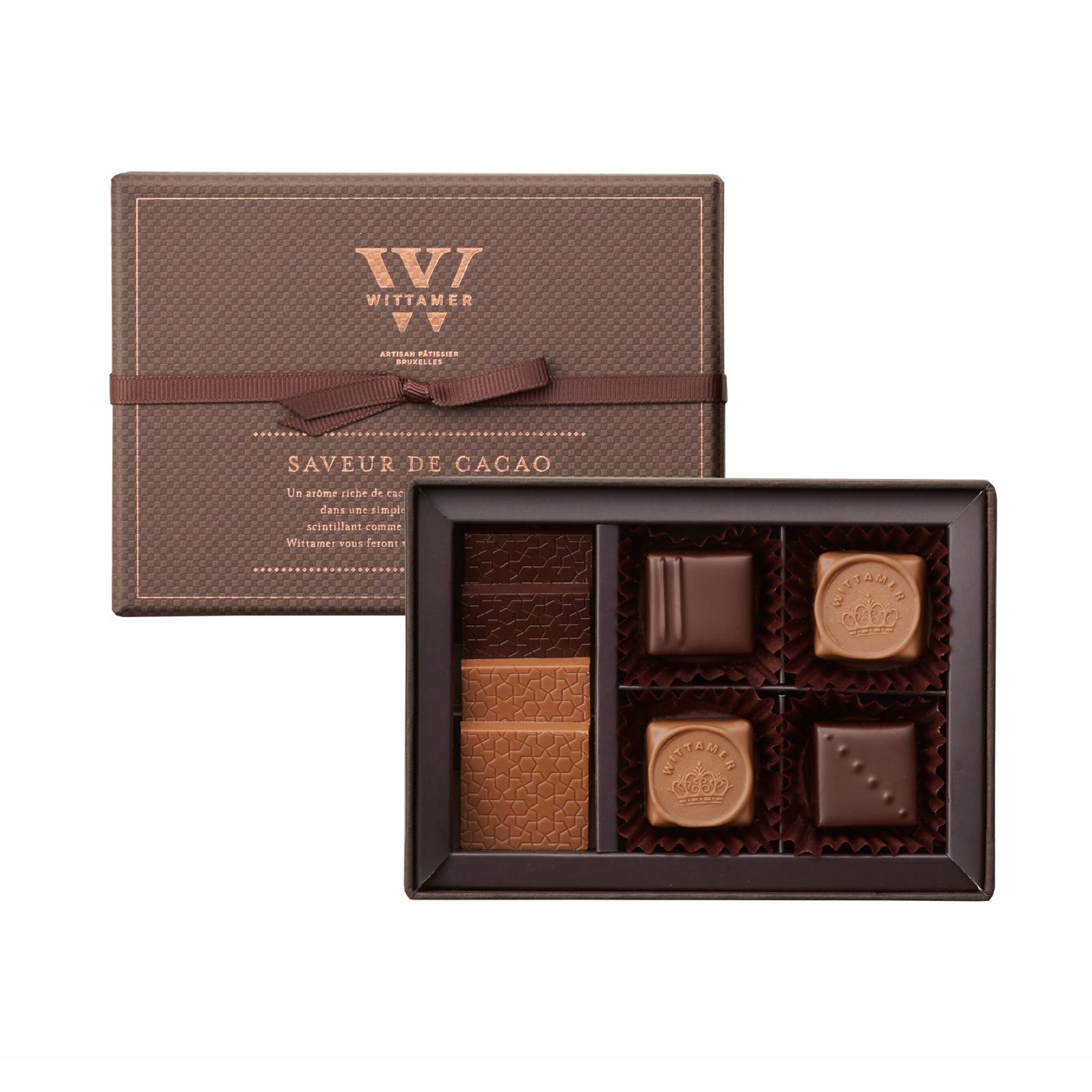 奥深い苦みや酸味、香りなどカカオ本来の味わいを生かしたシンプルで上品なショコラを詰め合わせた「サヴール・ド・カカオ」。サントメ島産カカオを使用した“サントメ”や希少なホワイトカカオを使用した“カカオ・ブランコ”、メドウミルクを使用したミルクチョコレートの“レ・テロワール”など奥深いチョコレートの味わいをお楽しみいただけます。