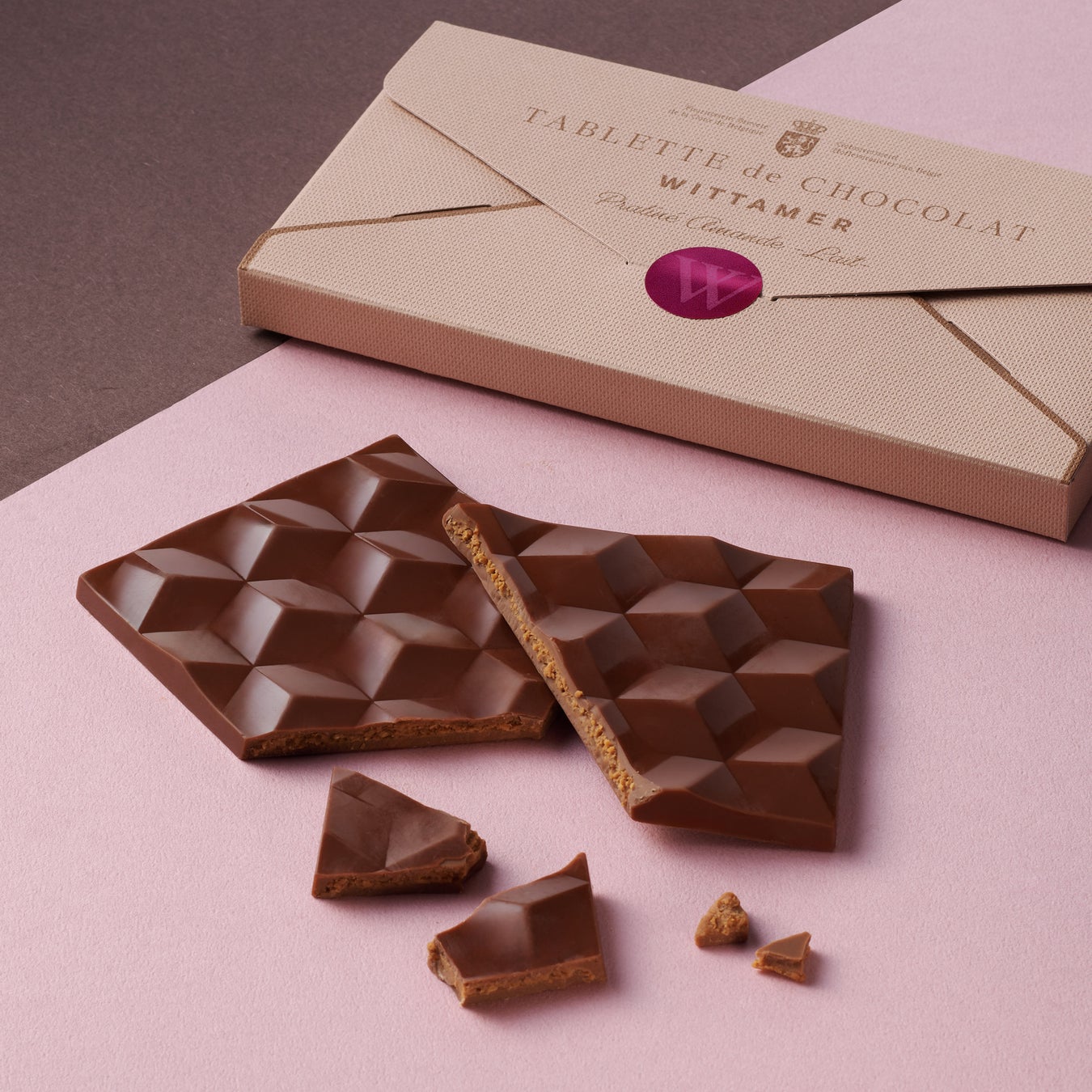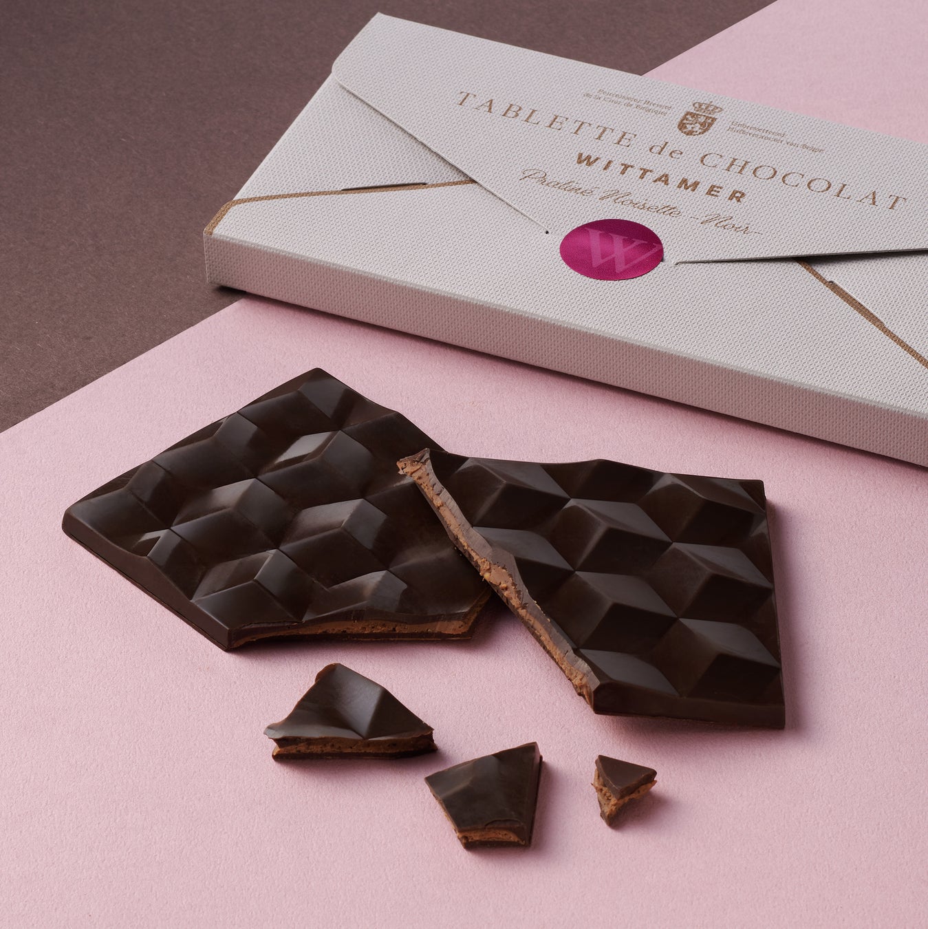 香ばしいナッツのプラリネをクーベルチュールチョコレートにとじ込めたタブレット。