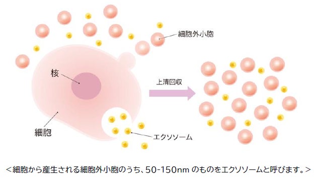 エクソソームは細胞から分泌される直径50-150nm(ナノメートル:10億分の1メートル)の顆粒状の物質で、体内で細胞同士の情報伝達の役割を果たしています。現在、脂肪・臍帯(さいたい)・歯髄(しずい)由来の幹細胞から分泌されたエクソソーム(以下、「幹細胞エクソソーム」)が美容用途として広く流通しています。