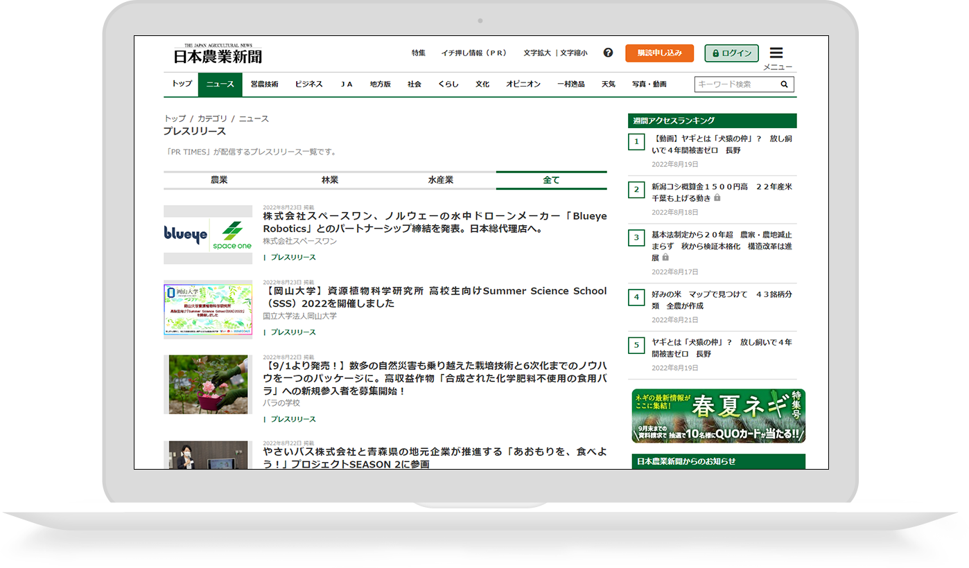 「日本農業新聞電子版」の読者にとっては、日本農業新聞に掲載されている記事コンテンツや電子版オリジナルコンテンツとともに、農業・林業・水産業界に関連するプレスリリースコンテンツをサイト上で閲覧できることにより利便性が高まることが期待されます。読者に関連業界に関する情報を網羅的に伝えようとする「日本農業新聞電子版」の媒体価値向上にもつながると考えています。