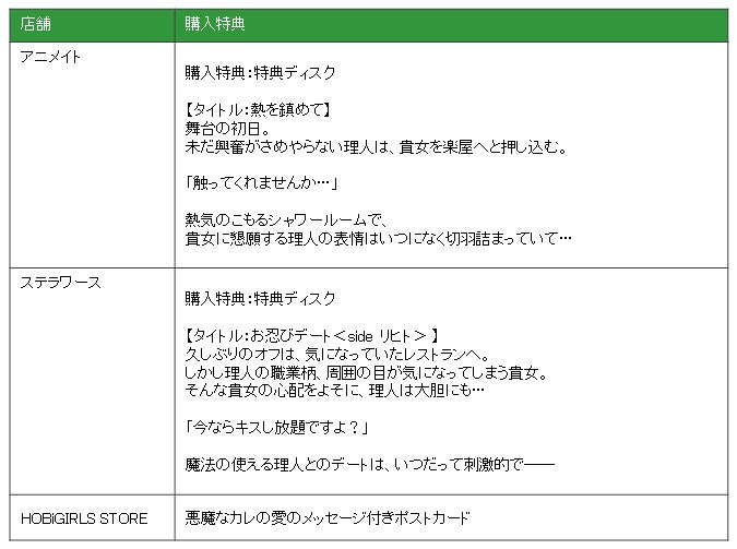 | ステラワース | 購入特典:特典ディスク 【タイトル:お忍びデート<side リヒト> 】 久しぶりのオフは、気になっていたレストランへ。 しかし理人の職業柄、周囲の目が気になってしまう貴女。 そんな貴女の心配をよそに、理人は大胆にも… 「今ならキスし放題ですよ?」 魔法の使える理人とのデートは、いつだって刺激的で── |