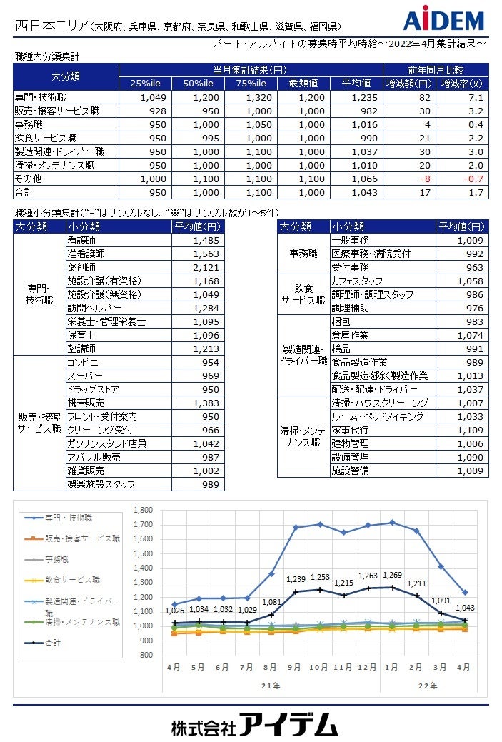 - 西日本エリア全体の平均時給は、前年同月比17円増の1,043円