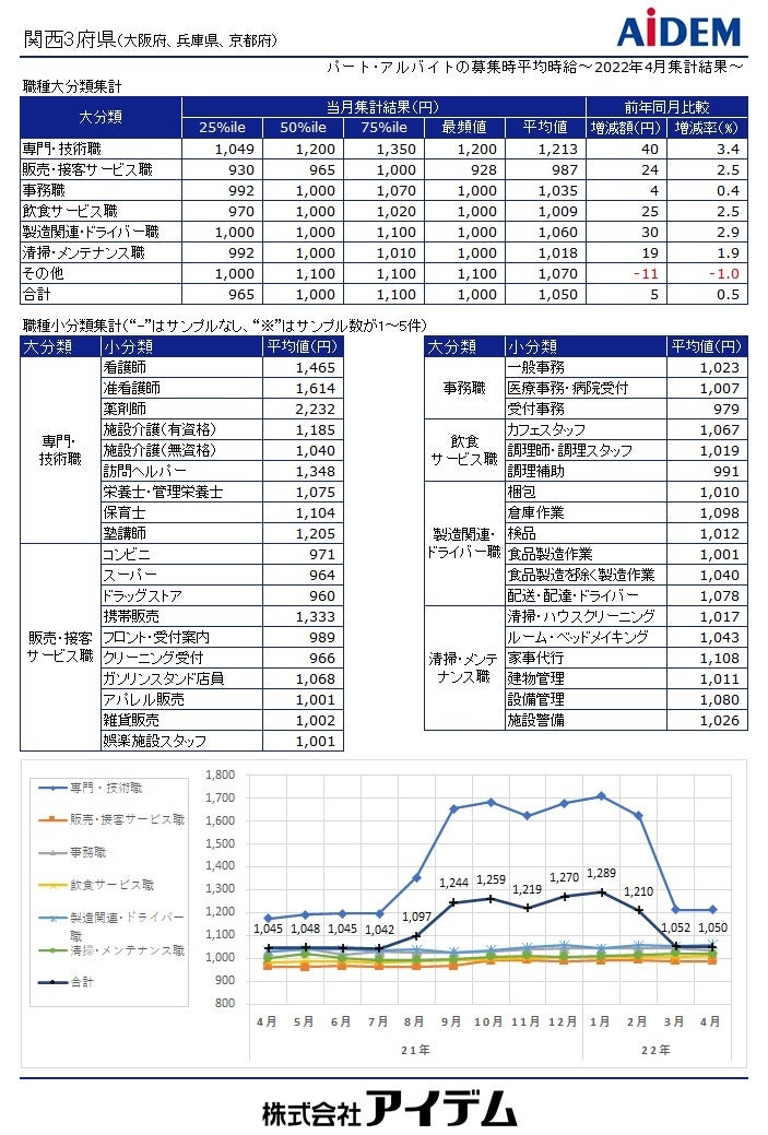 - 関西3府県全体の平均時給は、前年同月比5円増の1,050円