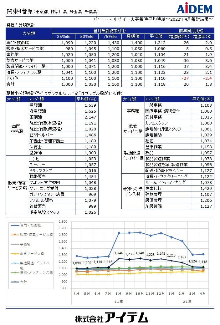 総合人材情報サービスの株式会社アイデム(本社:東京都新宿区 代表取締役社長:椛山 亮)は、求人メディア『イーアイデム』や採用ホームページ構築サービス『Jobギア採促』を利用して公表された求人情報から、2022年4月のパート・アルバイト募集時平均時給を集計いたしました。