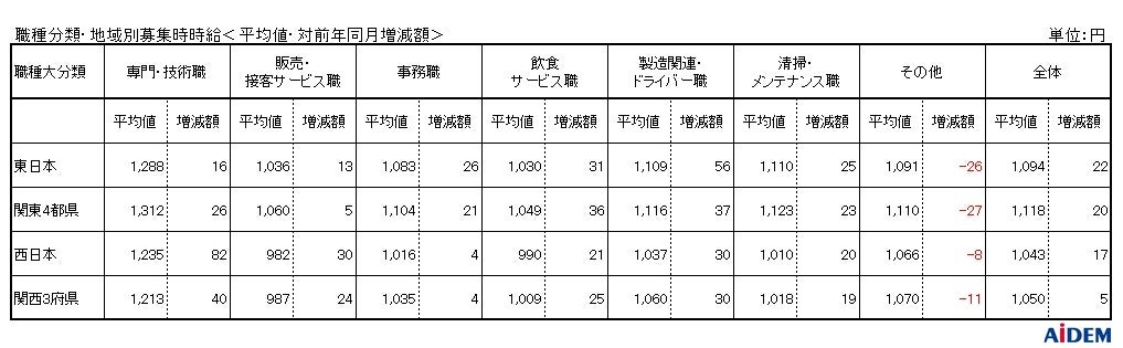- 東日本エリア全体の平均時給は、前年同月比22円増の1,094円